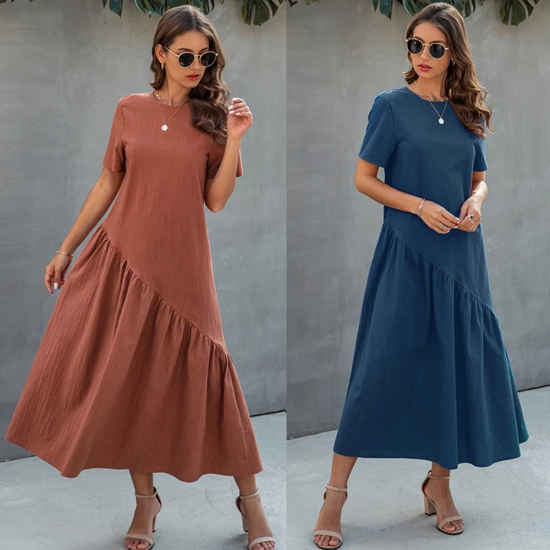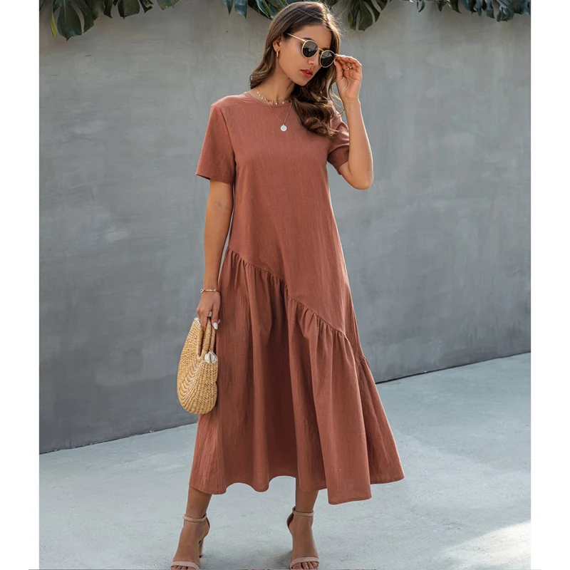Женское платье-футболка, летние длинные платья с рюшами, женское элегантное свободное платье средней длины