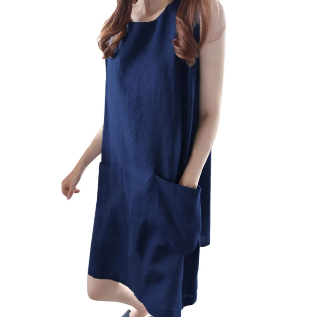 Модное женское Повседневное платье без рукавов с круглым вырезом и карманами из хлопка и льна