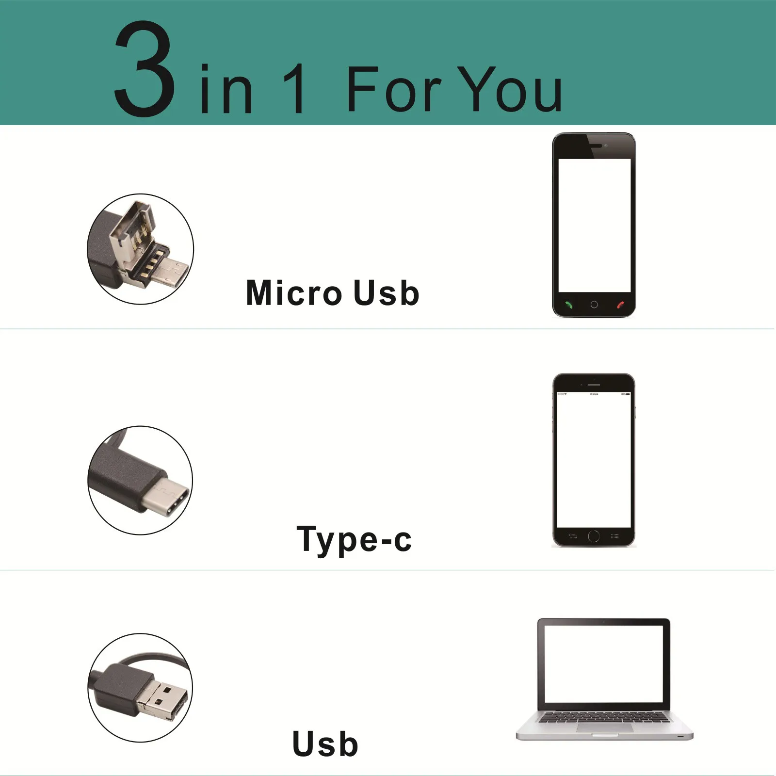 Дизайн 3-в-1 для того, чтобы широко совместим с Android USB, ПК, USB и Тип-C для более удобного подключения.