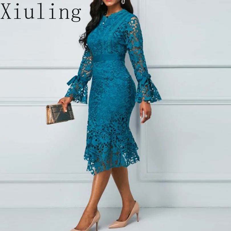 Европейское кружевное офисное элегантное платье большого размера 2020, весна-лето, женское свободное Повседневное платье с длинным рукавом, сумка в стиле хип-хоп размера плюс, Размер 5xl