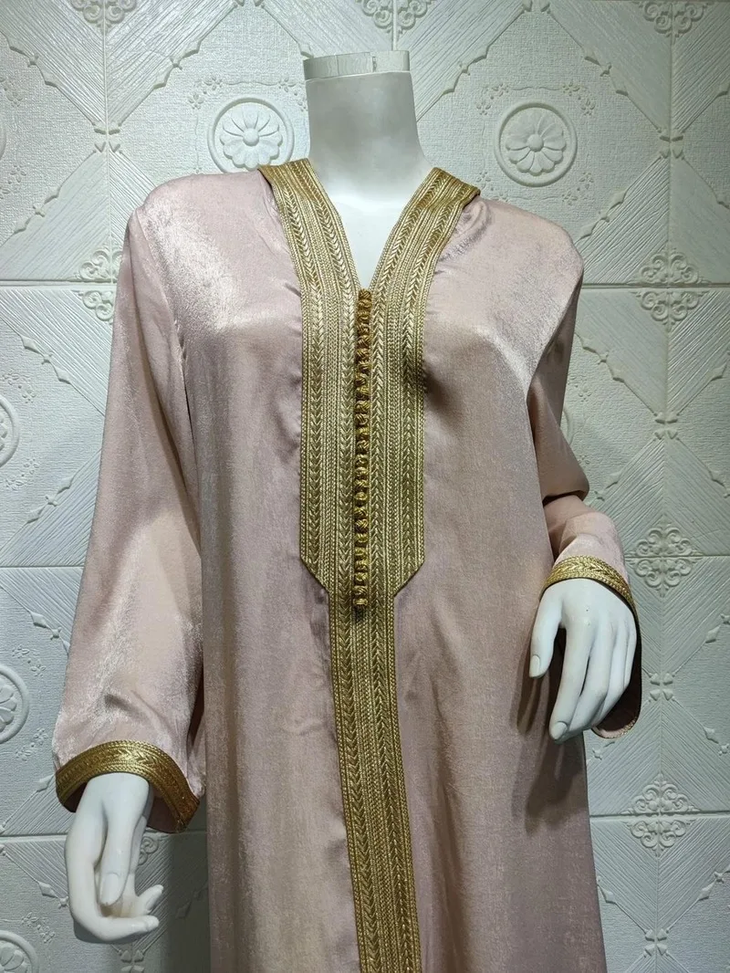 Арабский платья для женщин осень 2020 Золотая лента лоскутное V шеи платье макси с длинным рукавом мусульманская Турецкая одежда атласная