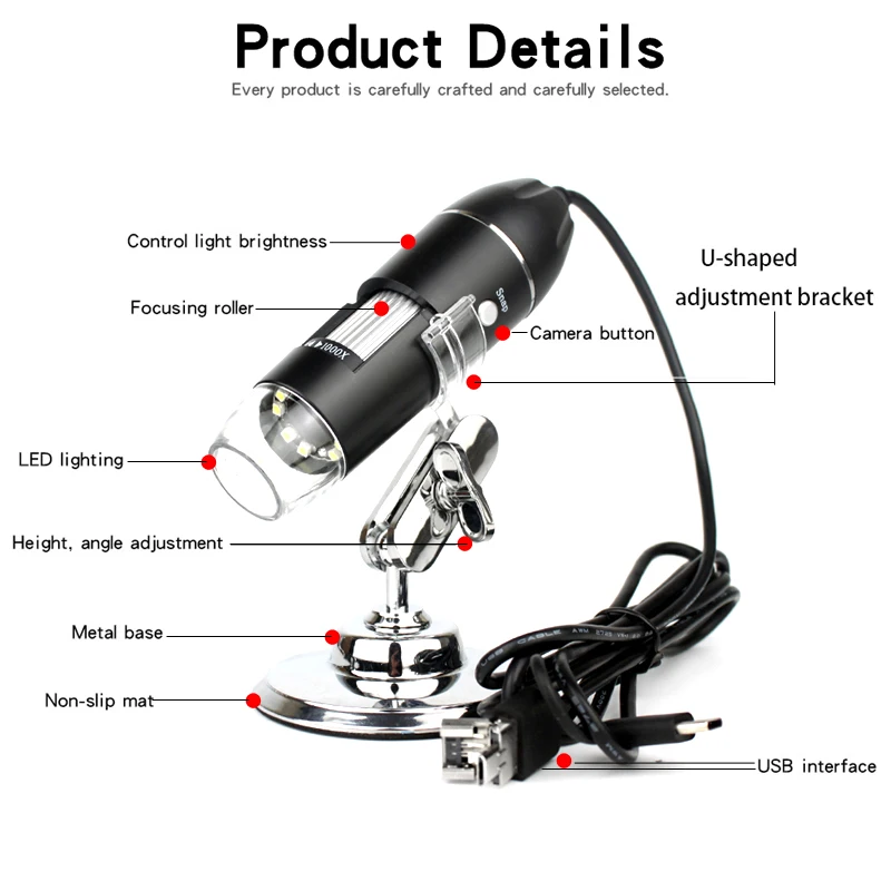 1.1600X Увеличение: 1600x увеличивает, фиксирует четкие детали. Встроенный 8 светодиодный светильник.2. Высококачественный Карманный микроскоп: Высококачественная противоскользящая ручка, Удобная и прочная. Этот портативный микроскоп является идеальной игрушкой для детей, чтобы исследовать микро мир, а также подходит для людей, которые любят наблюдать за насекомыми, кожей, печатной платой и многими интересными предметами.3. Тщательная проверка, проверка текстиля, проверка ювелирных изделий, инспекция коллекций/монет, инспекция печати, инспекция PCB orPCBA и так далее.4. Микроскоп состоит из высококачественных IC и электронных компонентов, с четким качеством изображения, низким энергопотреблением, высоким разрешением, применяется к маленьким объектам, чтобы быть больше.5. Фото-и видеосъемка-лучший выбор распознавания мелких объектов.