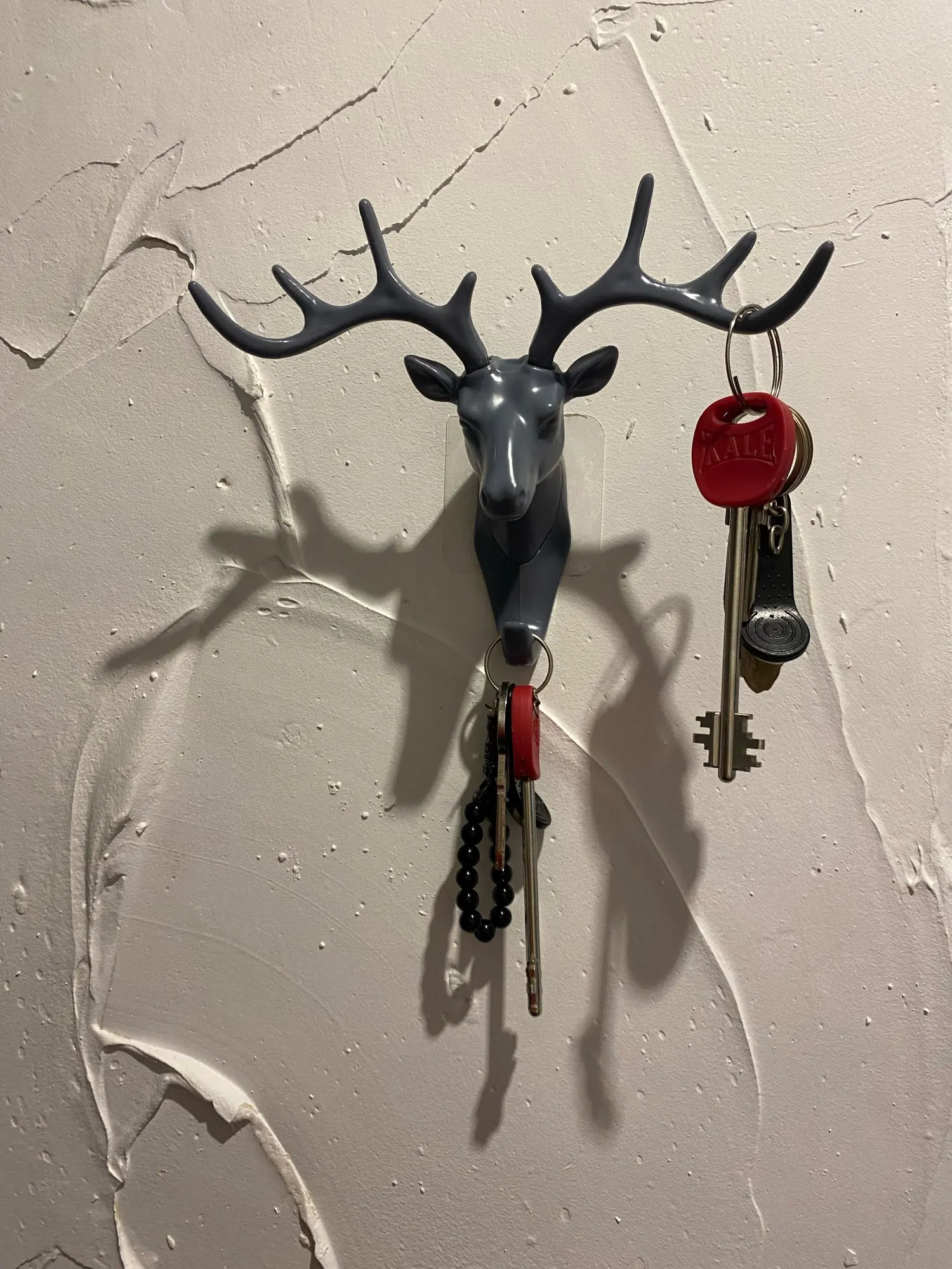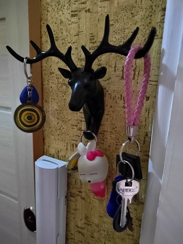 Упаковка пришла немного помятая но сам крючок не пострадал (только наклейка в одном месте слегка прогнулась).Но я думаю это была проблема не продавца, а самой отправки и доставки уже на территории моей страны.Крючок большой (думала будет чуть меньше), тем не менее, это не минус, а скорее плюс.Хорошо держится на стене (бетонной, покрашенной, слегка шероховатой, без обоев).Рога у оленьей головы съемные, в голову вставляются без проблем, держатся крепко.Пластик немного матовый, не глянцевый.Сама голова сделана подробно.Красиво смотрится в коридоре.Ключи висят нормально, не утяжеляют.
