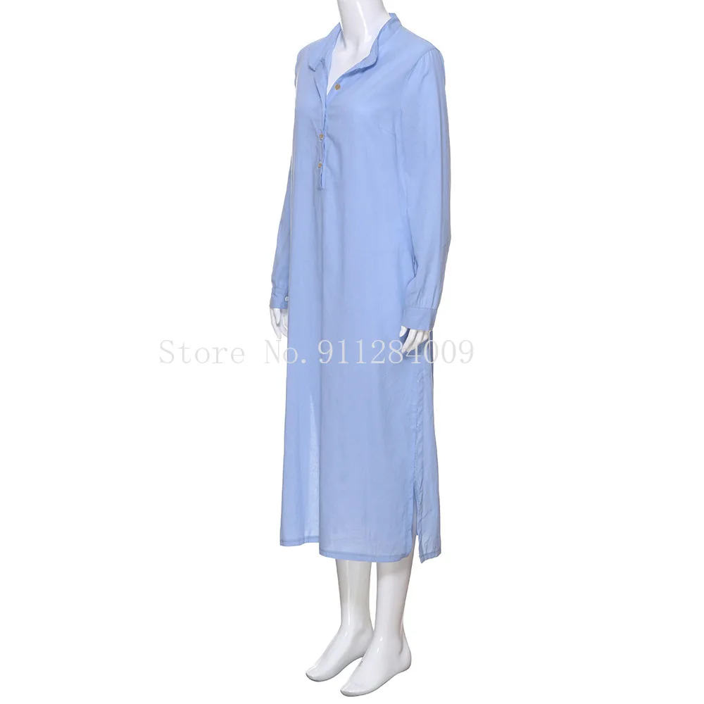 Повседневные женские свободные халат белого и синего цвета в винтажном стиле; Платье с длинными рукавами и отложным воротником, Рубашка-Платье на пуговицах, подол Разделение Макси платье Vestidos