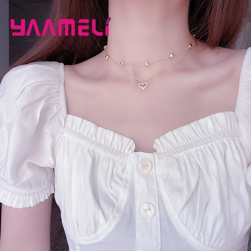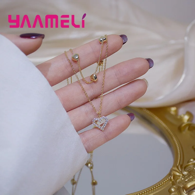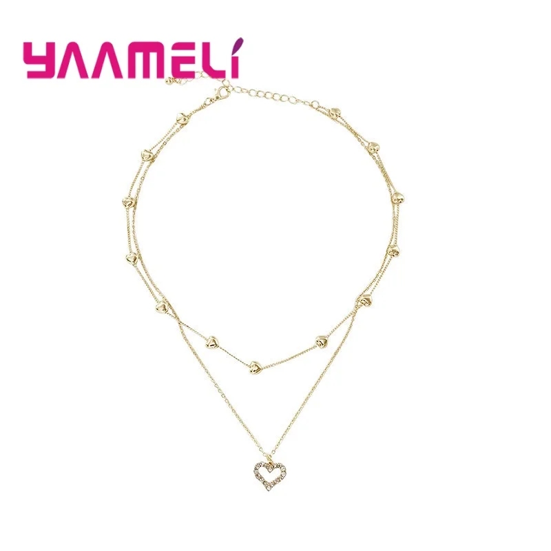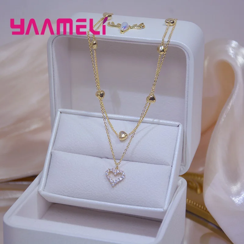 Ожерелье из серебра 925 пробы Двухслойное круглое блестящее ожерелье с подвеской в виде сердца из циркония подарок для девушки ювелирные изделия аксессуары