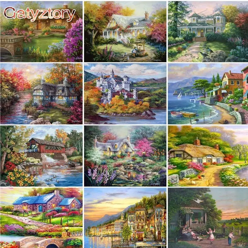 GATYZTORY дом фотографии Раскраска по номерам Цветочный дом ручная роспись украшение дома живопись маслом по номерам пейзаж полотно стены