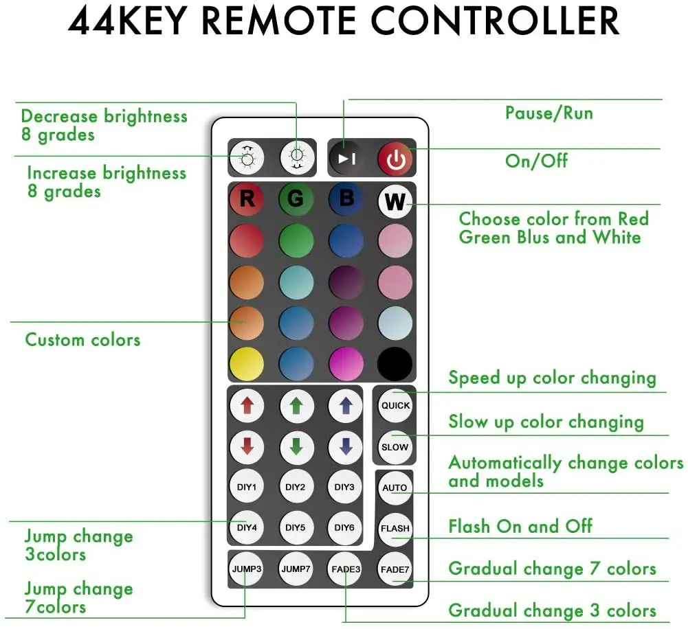 Сильный самоклеющийся: наши светодиодные лампы для спальни имеют сильный клей; Он может зафиксировать светодиод Светильник с полосками на дереве, металле, стекле, и он будет крепко липнуть на стене; Убедитесь, что Поверхность Сухая, чистая и гладкая Изменение цвета и Многофункциональность: светодиодный светильник может обеспечить белый цвет и Дополнительные режимы 20 цветов и 8 светильник; Цвета изменяются с помощью пульта дистанционного управления с 44 клавишами, И может быть установлен для медленного скачка или быстрого скачка; Установите другой режим стиля для позднего утра Поздний завтрак, вечерние ужин или кино Простая установка: просто Простое подключение; Установите светодиодные фонари для спальни самостоятельно За считанные секунды; Самоклеющаяся задняя часть с клейкой лентой для безопасного и легкого нанесения, не беспокойтесь О падении Широкое использование: пульт дистанционного управления может затемнить свет и предлагает 44 различных цвета и режимы; С Гибкость, тонкий, чистый цвет и многие другие характеристики, они широко используются в Отели, клубы, компьютерный стол, гараж, под шкаф, свадьба, гостиные, подъезды, бар, Особенно для праздников и мероприятий