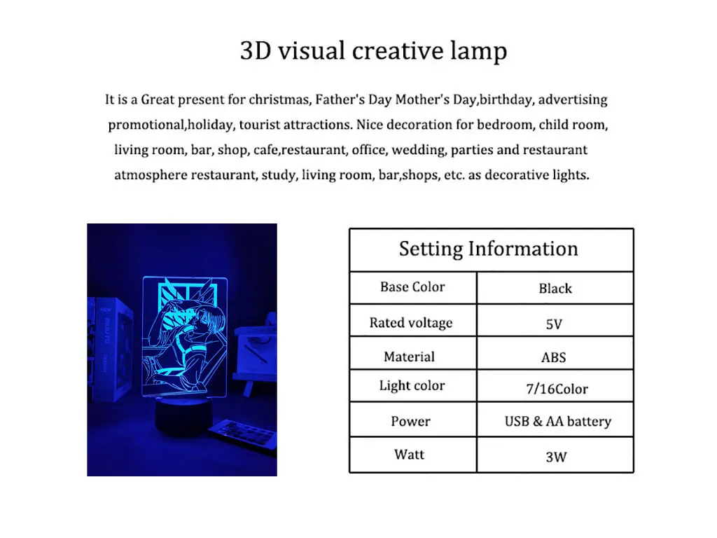 ✔. Если у вас есть индивидуальные требования, пожалуйста, откройте чат и отправьте нам фотографии, которые вы хотите сделать 3D ночной светильник.