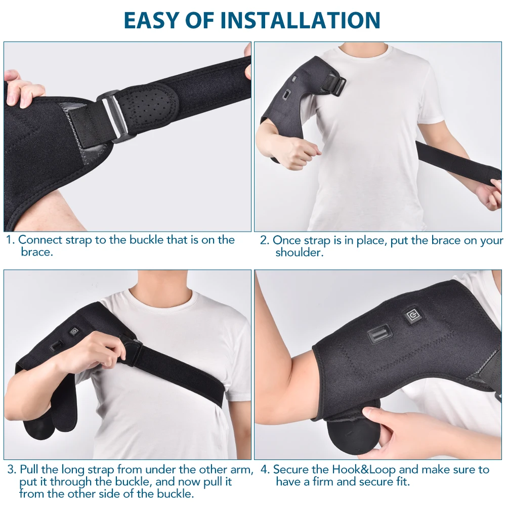 1. Подключите ремешок к застежке, которая находится на скобе.2. Как только ремень будет на месте, положите бандаж на плечо.3. Вытяните длинный ремешок из-под другой руки, поместите его через пряжку, и теперь потяните его с другой стороны пряжки.4. Закрепите крюк и петлю и убедитесь, что у вас прочная и надежная посадка.