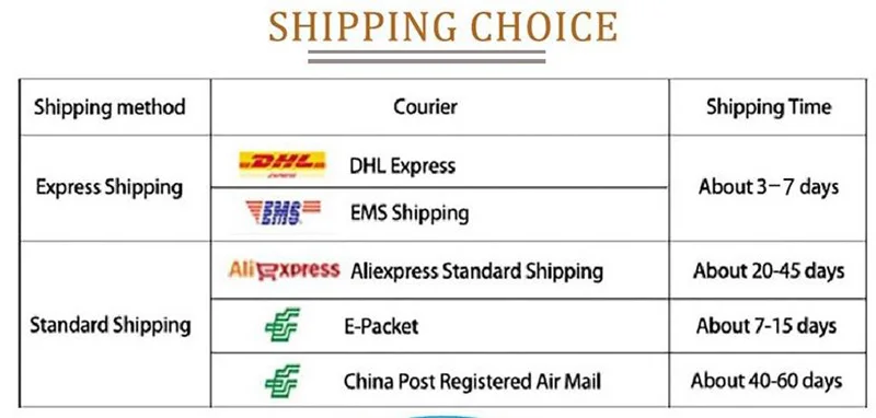 1. Вышеуказанная дата доставки только для справки, иногда может быть отложена в связи с праздниками, фестивалями, плохой погодой, таможней и т. д.2. Доставка авиапочтой в страны Восточной Европы, страны Южной Америки может занять более 60 дней.3. Экспресс-Доставка обычно имеет проблемы с таможенным налогом, в этом чехол, пожалуйста, сотрудничайте с таможней, чтобы оплатить налог.