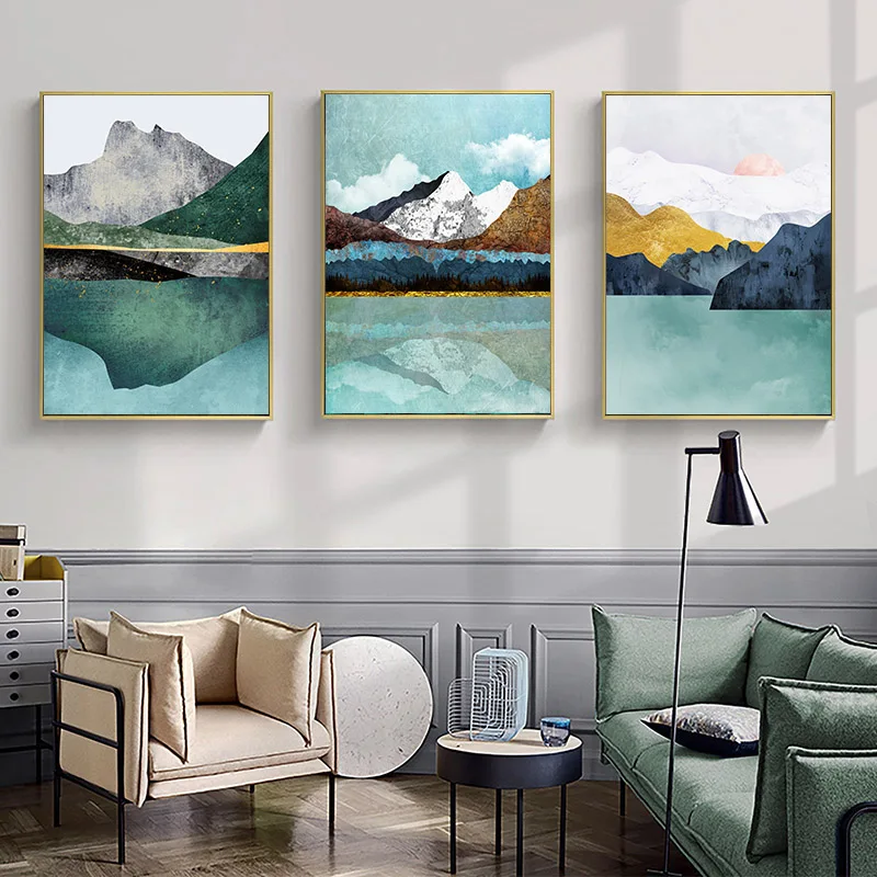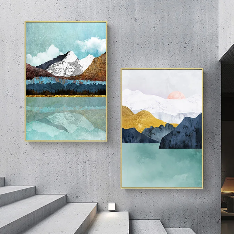 Темно-зеленое озеро и золото солнце снег горы холст искусство абстрактная Скандинавская живопись пейзаж Картина бирюза домашний декор