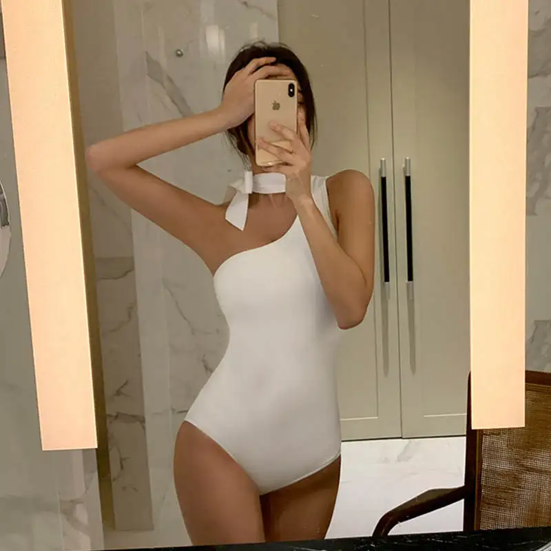 Новинка 2021, корейский пикантный облегающий купальник на одно плечо с бретельками и маленькой грудью, элегантный весенний купальник