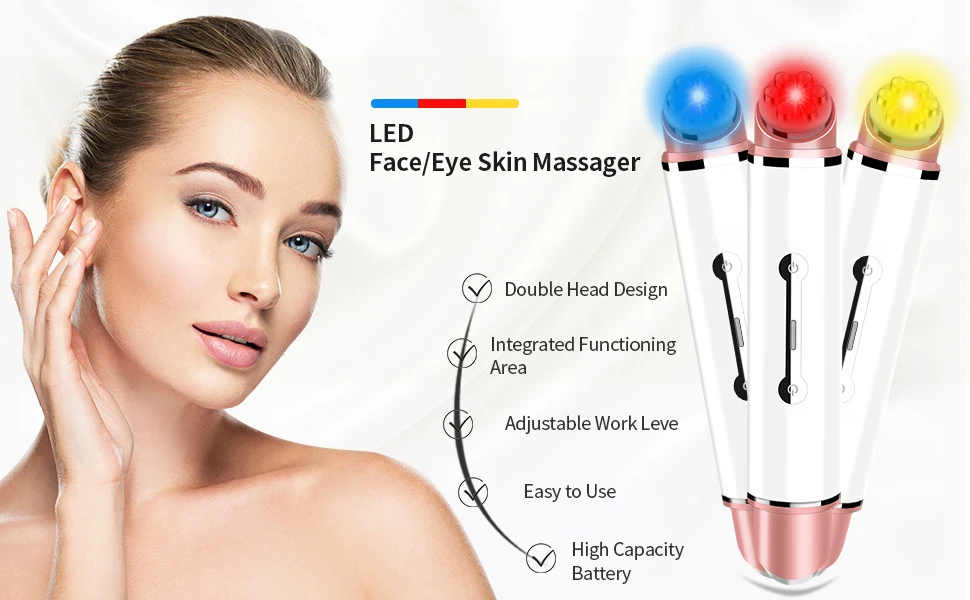 -EMS тока и технологии RF-Улучшает тонкие линии на поверхности кожи и подтягивает контуры кожи лица.-Высокочастотная вибрация, горячий сжатие 43 ℃, чтобы помочь рассеять осаждение глазных сокетов.-Фотонная терапия: 3 вида светодиодный светильник, такие как: красный, желтый и синий светодиодный светильник, появляются в режиме горячей и холодной терапии, которая помогает омолаживать кожу и лечение акне.-Глубокое увлажнение и увлажнение, отбеливание кожи и удаление морщин.-Ультразвуковой импорт и экспорт trengten кожи поглощения питательных веществ.-Нанесение на глаза, лицо, шею и т. Д.-Портативные ручные устройства, подходят для домашнего использования или в других случаях.