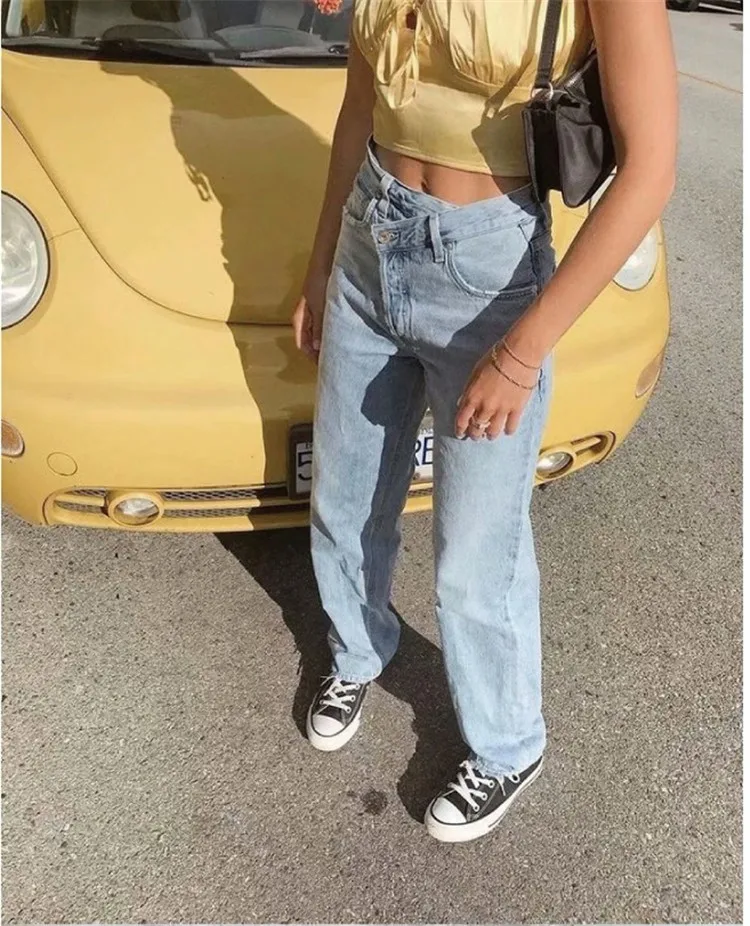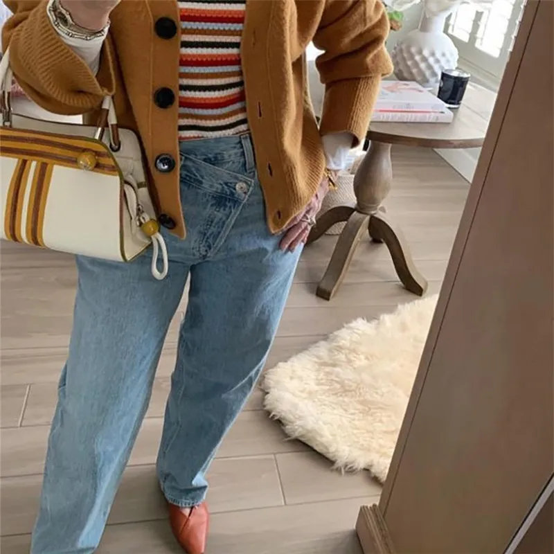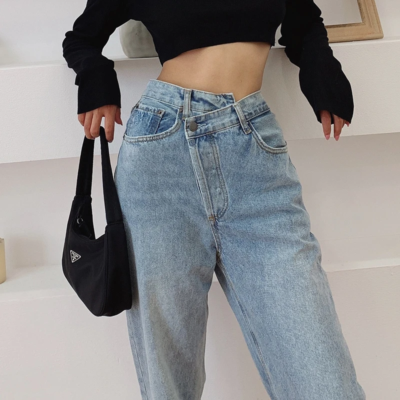 Женские джинсы с высокой талией, свободные прямые джинсы с асимметричным поясом