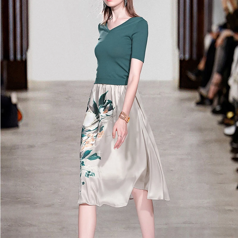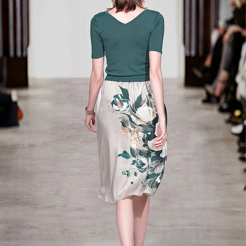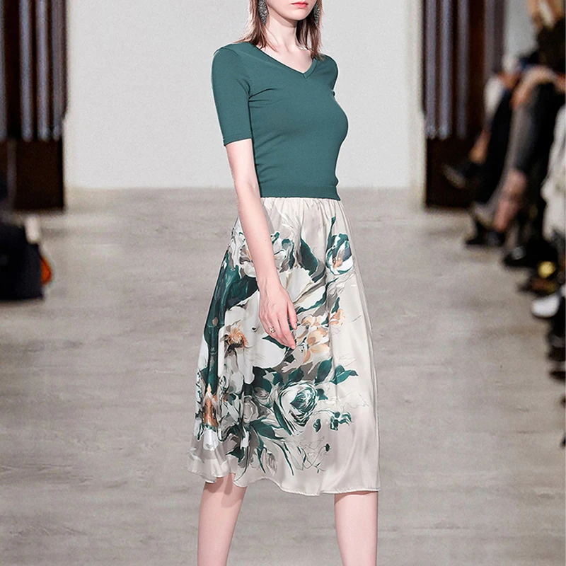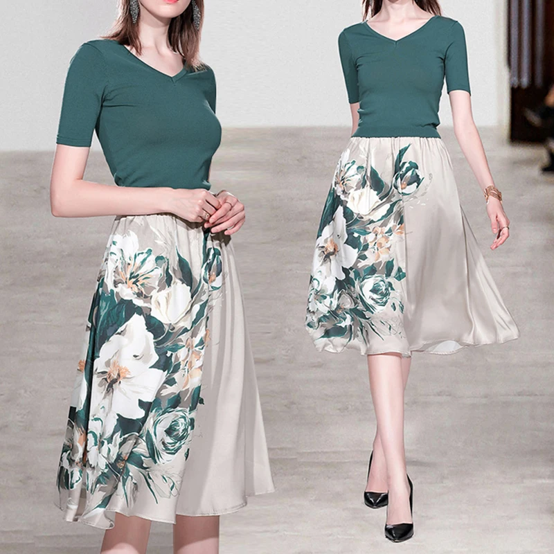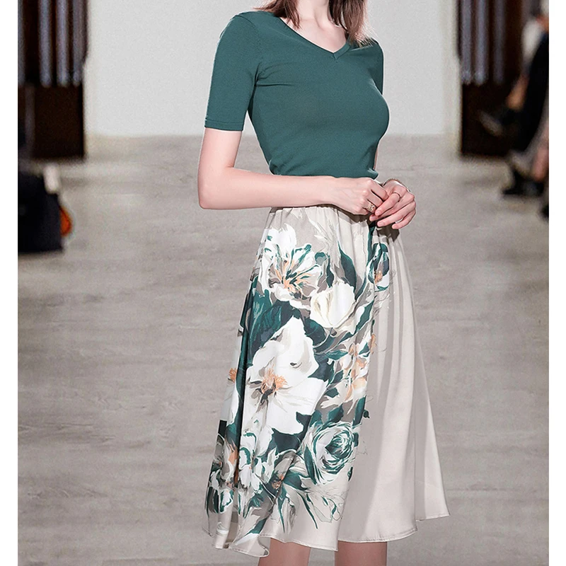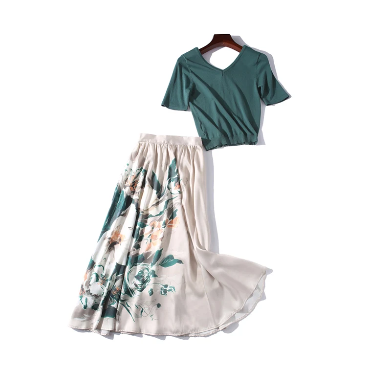 Женский костюм PERHAPS U, трикотажная блузка с V-образным вырезом и коротким рукавом, атласная юбка-трапеция с принтом, тонкий костюм из двух предметов, T3031