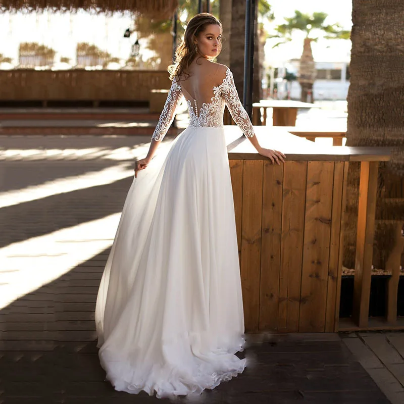Трапециевидные пляжные свадебные платья с рукавом три четверти Фона...