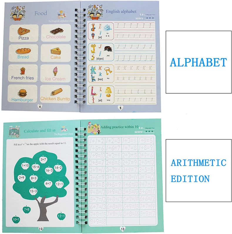 Удобная комбинация Английская Магия тетрадь для практики, включая цифровое издание, Веселый рисунок, Английский алфавит и арифметическое издание, также предлагается 1 набор автоматических выцветающих ручек, удобный комбинированный набор для вас Надежный и удобный Изготовленные из качественного картонного материала, эти волшебные книги для письма надежны в использовании и комфортны на ощупь, долговечны для письма; Размеры каждой книги Около 5,1 х 7,5 дюйма/13 х 19 см, детям достаточно места для практики письма, пожалуйста, проверьте размер перед покупкой Весело, но практично Благодаря трехмерному дизайну канавки эти тетради для рисования рукописного ввода могут стандартизировать стандартный формат письма, весело, но практично для детей в повседневной жизни повышают интерес: эти волшебные книги по каллиграфии с забавным графическим сочетанием, яркими цветами и милыми формами, которые могут улучшить память и интерес ребенка, Доставляя им много удовольствия, дети могут многое узнать из него Применяется повторно С этими автоматическими выцветающими ручками текст на книге может автоматически выцветать через 10 минут, а это означает, что дети могут применять магическую практику каллиграфии много раз, также больше не беспокоятся о совершении ошибок