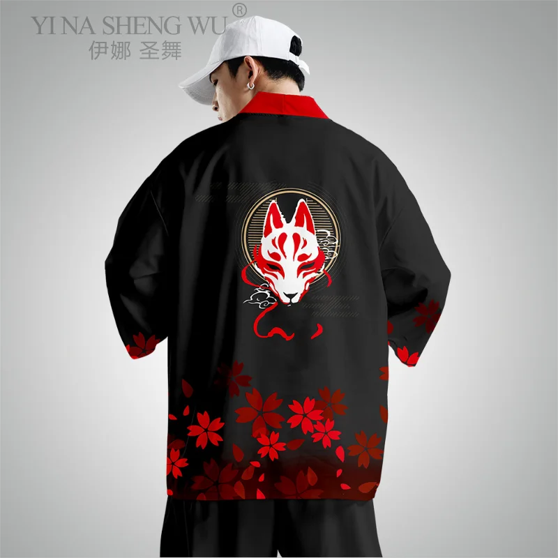 Кимоно для мужчин с принтом Black Fox, Модный комплект из пальто и брюк в японском стиле, хаори Оби, азиатская одежда, размера плюс XS-6XL