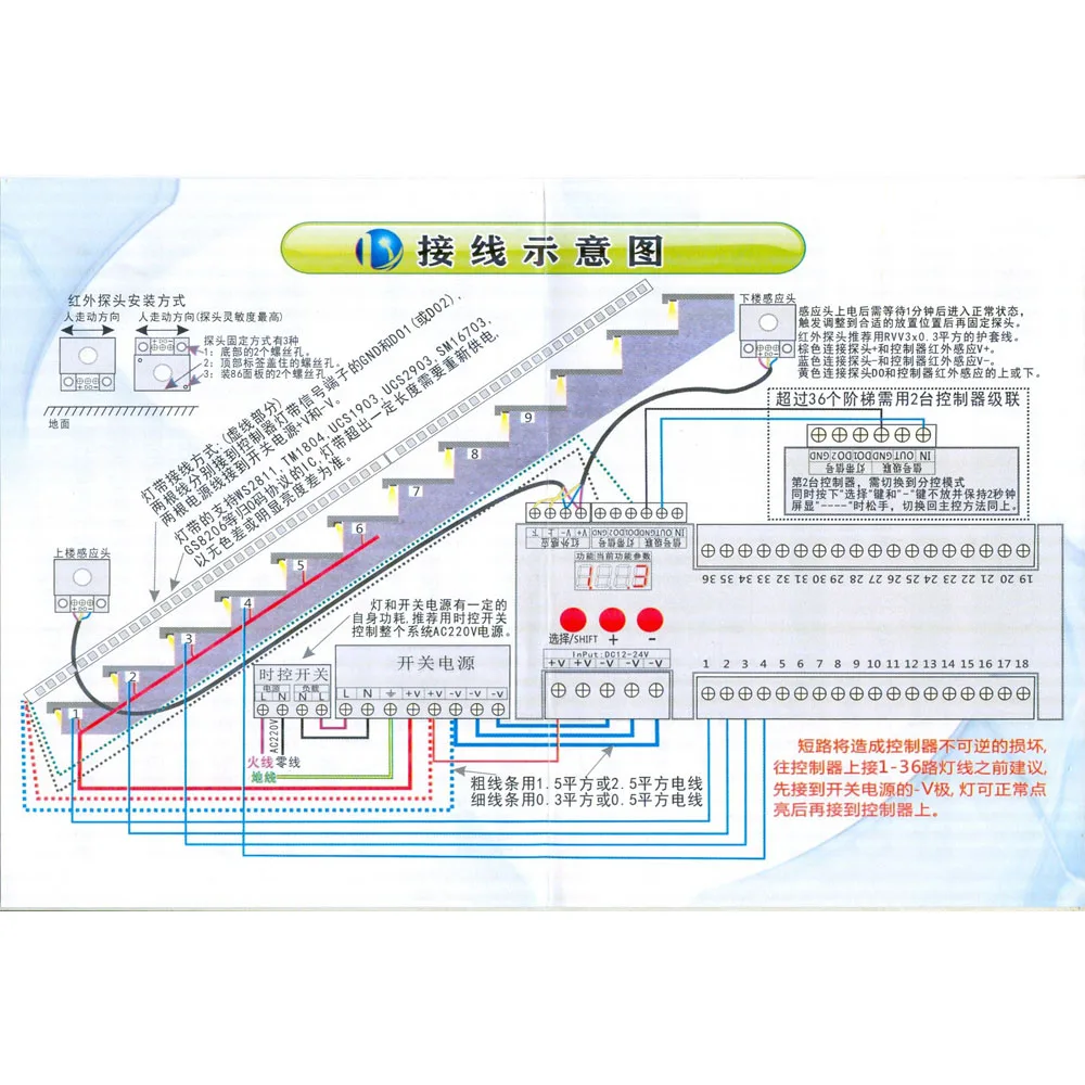 * В приведенных ниже словах вместо номера, Пожалуйста, знайте, спасибо.1. Когда вы включите контроллер, он будет отображаться **-L, это скорость скачки светильник, который должен быть установлен на перила или стене, вы можете нажать скорость +, или скорость-легко регулировать скорость работы.2. Если вы хотите изменить эффект, нажмите кнопку set, чтобы выбрать параметры, пожалуйста.3. Когда вы нажимаете набор, он отображает L ***, это пиксель лошади, нажмите скорость +/скорость-для регулировки. Если вы используете 20IC/m (60 светодиодов/м) ленточный светильник, он может управлять длиной около 40 м.4. Когда он отображает LP **, это Цвет Скачки светильник, нажмите скорость +/скорость-для регулировки, есть белый-красный-зеленый-синий-желтый-фиолетовый-голубой, И автоматическое изменение доступно на выбор.5. Когда он отображает LH **, это светильник скорости скачки, нажмите скорость +/скорость-для регулировки.6. Когда он отображает F ***, это Настройка лестницы, нажмите скорость +/скорость, чтобы настроить, сделайте это же количество на вашей лестницы.7. Когда он отображает FP **, это лестничный светильник, работающий в режиме, это только один на данный момент, не может быть изменен.8. Когда он отображает FH **, это скорость освещения лестницы вверх, нажмите скорость +/скорость-для регулировки, увеличение числа, скорость вниз.9. Когда он отображает E ***, это время задержки после того, как весь светильник включен, это не реальное время жизни, вы можете попробовать настроить его по скорости +/скорости.* Светильник для скачек (L ***) * его скорость бега (LH **) = количество лестниц (F ***) * его светильник, увеличивающий скорость (FH **)Нажмите «установить» снова на дисплее **-L, он автоматически сохранит настройки, которые вы сделали, когда вы перезагрузите систему, она применит настройки.