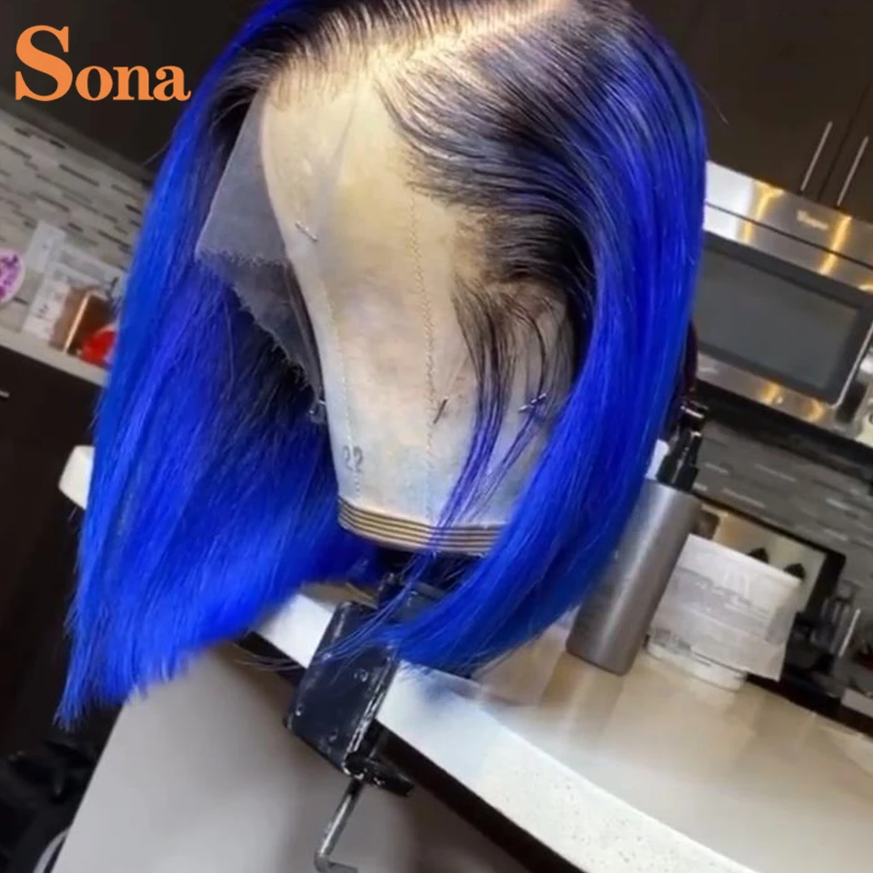 Короткий парик Боб на сетке спереди, предварительно выщипанный 13x6, Омбре, синие человеческие волосы, парики 180% бразильские Реми, Женский передний парик на сетке