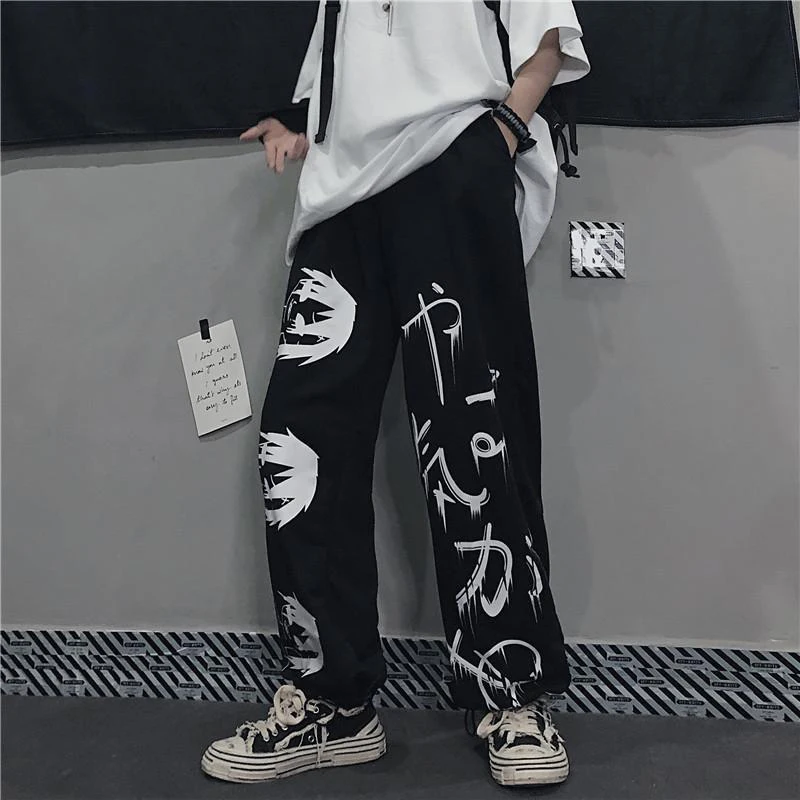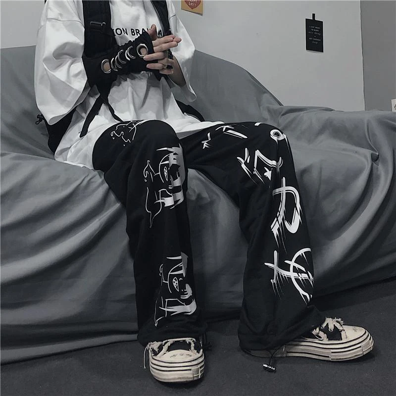 Брюки женские с широкими штанинами, винтажные свободные штаны в стиле Харадзюку С аниме принтом, с эластичным поясом, уличная одежда в стиле гранж-тёмный стиль, в стиле унисекс, панк, Y2K, Прямая поставка