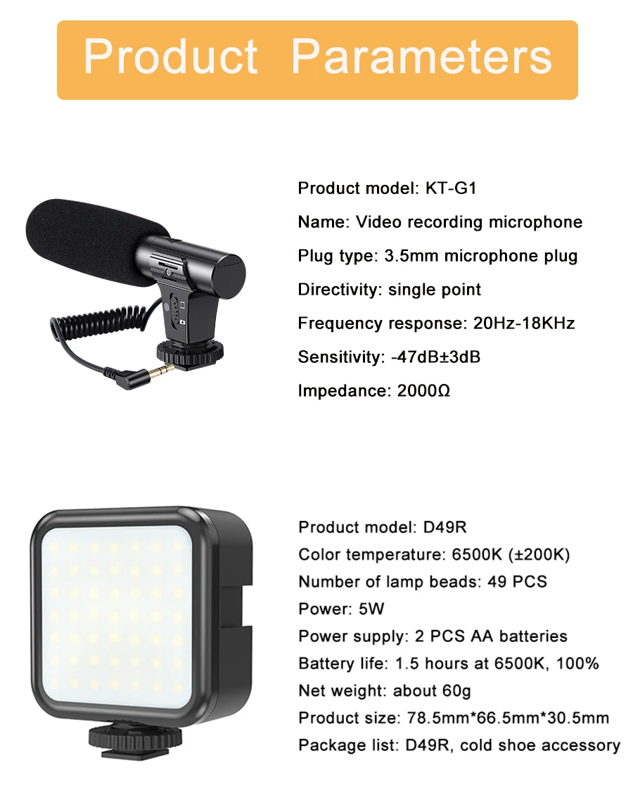 1. Универсальный штативМаксимальная рабочая высота составляет 117 см, можно поворачивать на 360 °, легко создавать изображения.Используется для Gopro, камер и смартфонов2. D36 светодиодный светильник для видеосъемкиНабор из 36 мощных светодиодовВстроенный аккумулятор AAНадежно подключается к креплению обуви на большинстве цифровых видеокамер и SLRsОн имеет 3 боковые крепления для холодного башмака для микрофона3. D49R светодиодный светильник для видеоНабор 49 мощных светодиодовВстроенный аккумулятор AAНадежно подключается к креплению обуви на большинстве цифровых видеокамер и SLRsОн имеет 3 боковые Холодный башмак для микрофон(Примечание: Нажмите долго, чтобы включить, нажмите еще раз, чтобы настроить яркость до 30% ~ 60% ~ 100%, затем нажмите выключить свет.)4. KT-G1microphoneТип штекера: 3,5 мм разъем для микрофонаНаправленность: одна точкаЧастотная характеристика: 20 Гц-18 кГцЧувствительность: -47 дБ + _ 3 дБСопротивление: 2000 Ом5. Пульт дистанционного управления BluetoothМаксимальное расстояние около 30 футовНабор Vlogging предназначен для улучшения ваших видео с лучшим звуком и светильник, работающий как внутри, так и на открытом воздухе, он оснащен универсальным микрофоном для работы на любом смартфоне или камере, светодиодный светильник с 36 супер яркими светодиодами, Рукоятка для штатива, которая может использовать его в качестве штатива для видеосъемки и адаптера смартфона со встроенной обувью, которая позволяет устанавливать не только ваш телефон, но также светильник или микрофон.Модель продукта:LED-M2 SEБусины лампы: 96Цветовая температура CCT: 3000-6500KЕмкость аккумулятора: 4000 MHAНапряжение: 3,7 VВремя работы: Максимальная мощность 2 чРабочее напряжение: 10 ВтВес: 204 гРазмер: длина 139 мм * ширина 78 мм * толщина 12 мм3000-6500K Цветовая температура регулируемая, полноцветный светодиодный индикатор поддерживает яркость и насыщенность adjstment.
