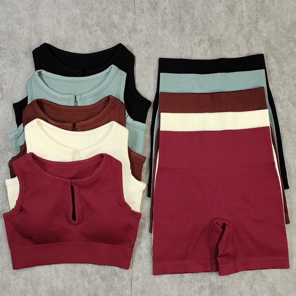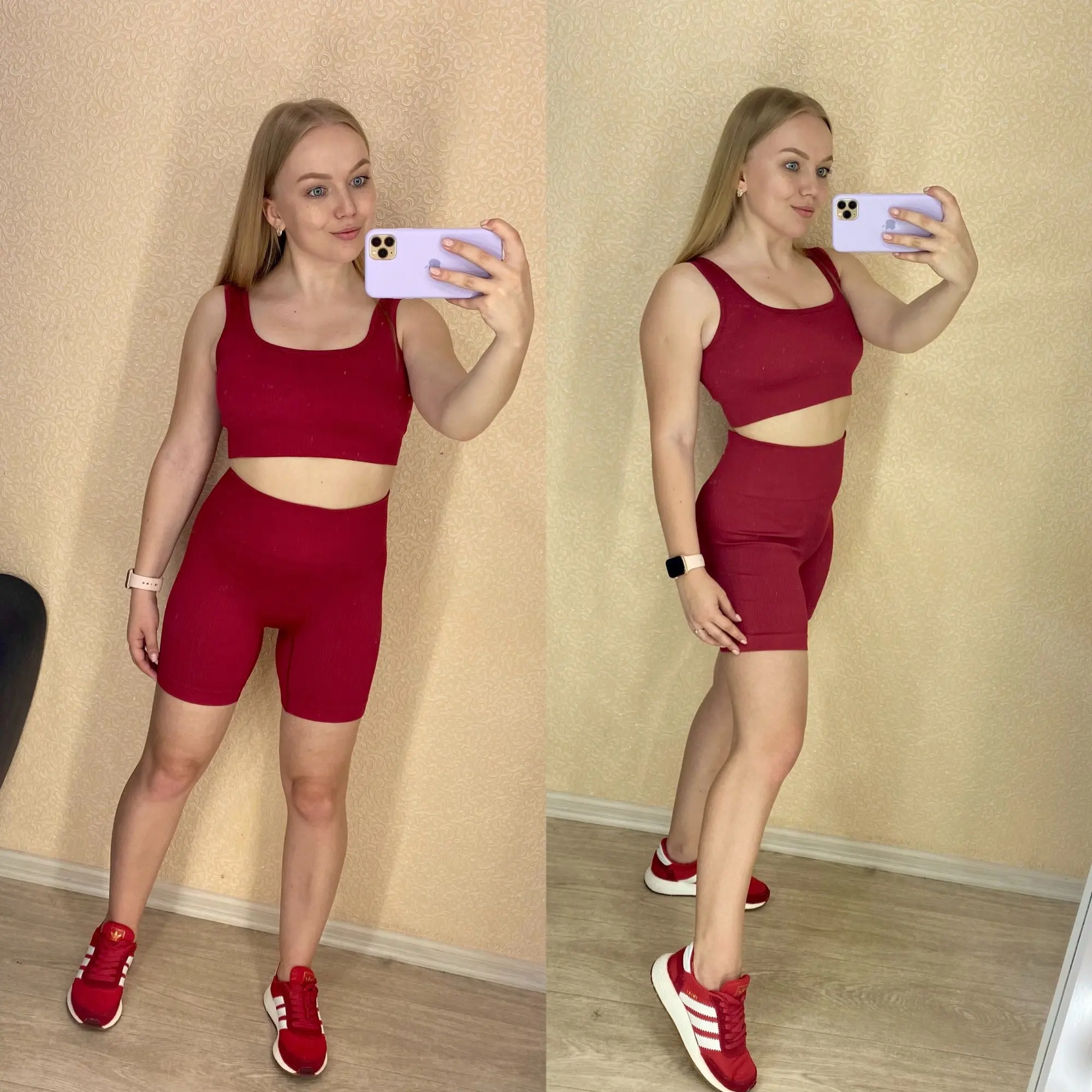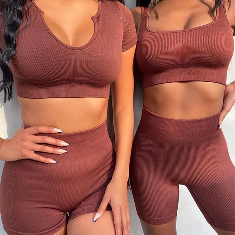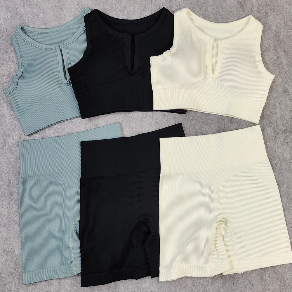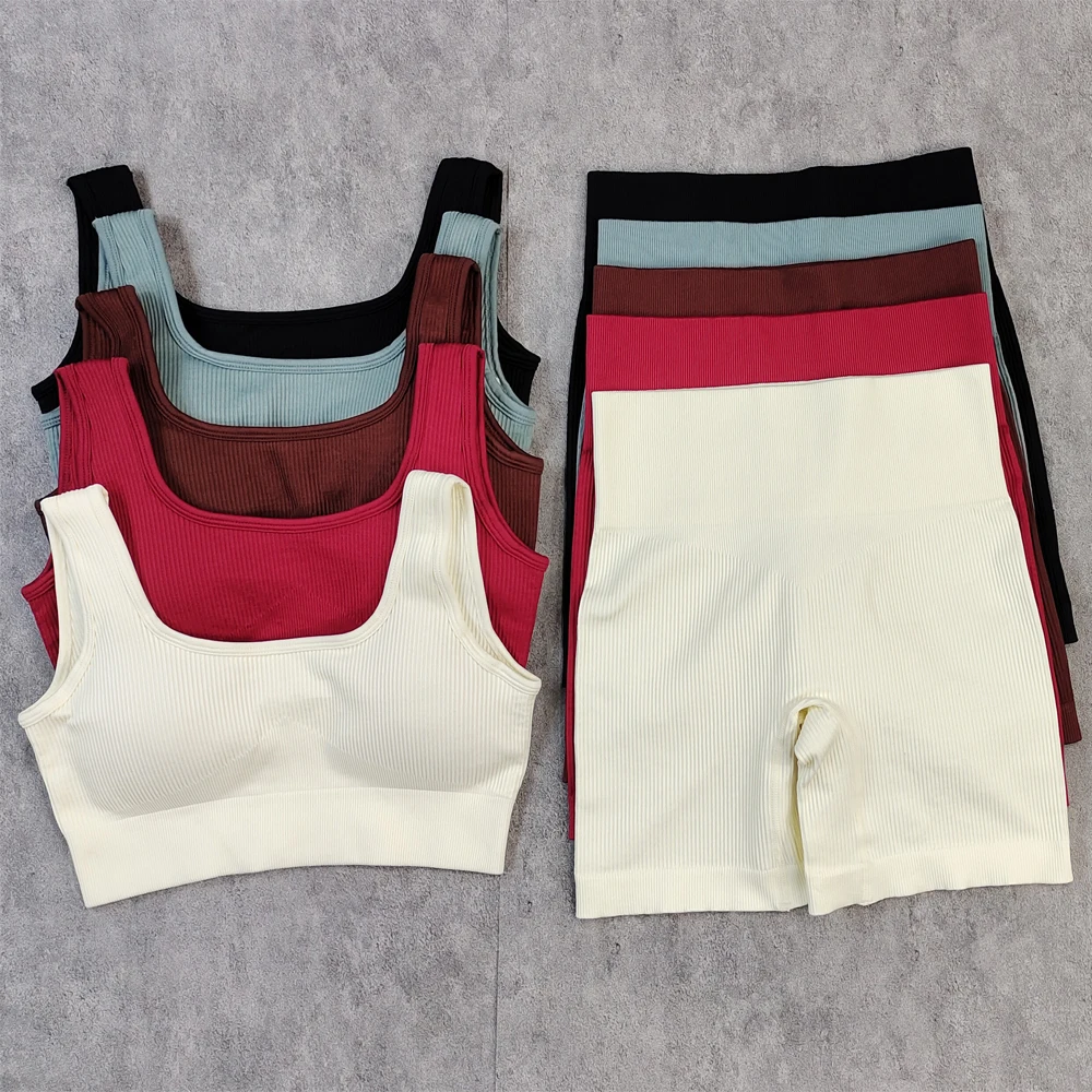 Костюм спортивный женский для фитнеса, бесшовный укороченный топ и шорты, в рубчик
