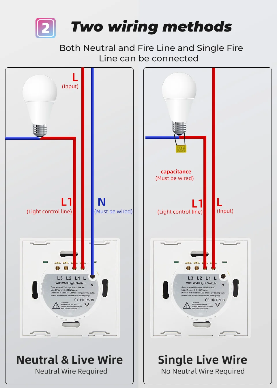 Можно подключить нейтральный провод и живой провод и один живой провод Мы более стабильны Он оснащен реле внутри, которое является более стабильным, чем переключатели на рынке и имеет более длительный срок службы. Уникальный mnemonic Значок переключателя с одной кнопкой соответствует индикаторному светильник, не беспокойтесь о выключении неправильного индикатора светильник Голосовое управление Он полностью совместим с Amazon Alexa и Google Home / Tmall Genie. Светильник с индикатором Не беспокоить сон, войти, чтобы сделать вас более безопасным в темноте Функция обратного отсчета Вы можете установить таймер обратного отсчета для увлажнителя, микроволновой печи и мусорного бака, и устройство автоматически остановится. Управление везде Независимо от того, где вы находитесь, вы можете включить/выключить светильник Семейный обмен контроль удовольствия Главная учетная запись имеет эксклюзивные разрешения и может быть разделена со всей семьей Метод установки Нейтральная и противопожарная линия Пожарная проволока соединяет терминал «L» Нейтральный провод соединяет терминал «N» Провод освещения соединяет "L1,L2, L3,L4" терминал" 1 банда соединяет терминал «L1» 2 банды соединяет терминал «L1,L2» 3 банды соединяет терминал «L1,L2,L3» 4 банды соединяет терминал «L1,L2,L3,L4» Одна пожарная линия Пожарная проволока соединяет терминал «L» Провод освещения соединяет "L1,L2, L3,L4" терминал" Затем установите конденсатор на лампу L1 1 банда соединяет терминал «L1» (затем установите конденсатор на лампу L1) 2 комплекта соединяет терминал «L1,L2» (затем установите конденсатор на лампу L1) 3 банда соединяет терминал «L1,L2,L3» (затем установите конденсатор на лампу L1) 4 комплекта соединяет терминал «L1,L2,L3,L4» (затем установите конденсатор на лампу L1) 1. Отсканируйте qr-код руководства или найдите «Smart Life» для загрузки и установки приложения устройства 2. После завершения подключения включите питание и работайте в соответствии со статусом индикатора smart switch: 3. Если красный светильник smart switch непрерывно мигает в это время, это указывает на то, что смарт-коммутатор прибыл в состояние ожидания подключения к WiFi; затем откройте приложение и следуйте инструкциям для подключения к WiFi. 4. Если светодиодный светильник smart switch не мигает красный светильник, нажмите кнопку smart switch и удерживайте его более 5 секунд, пока красный светильник не начнет мигать непрерывно, затем откройте приложение и подключите к WiFi в соответствии с руководством.