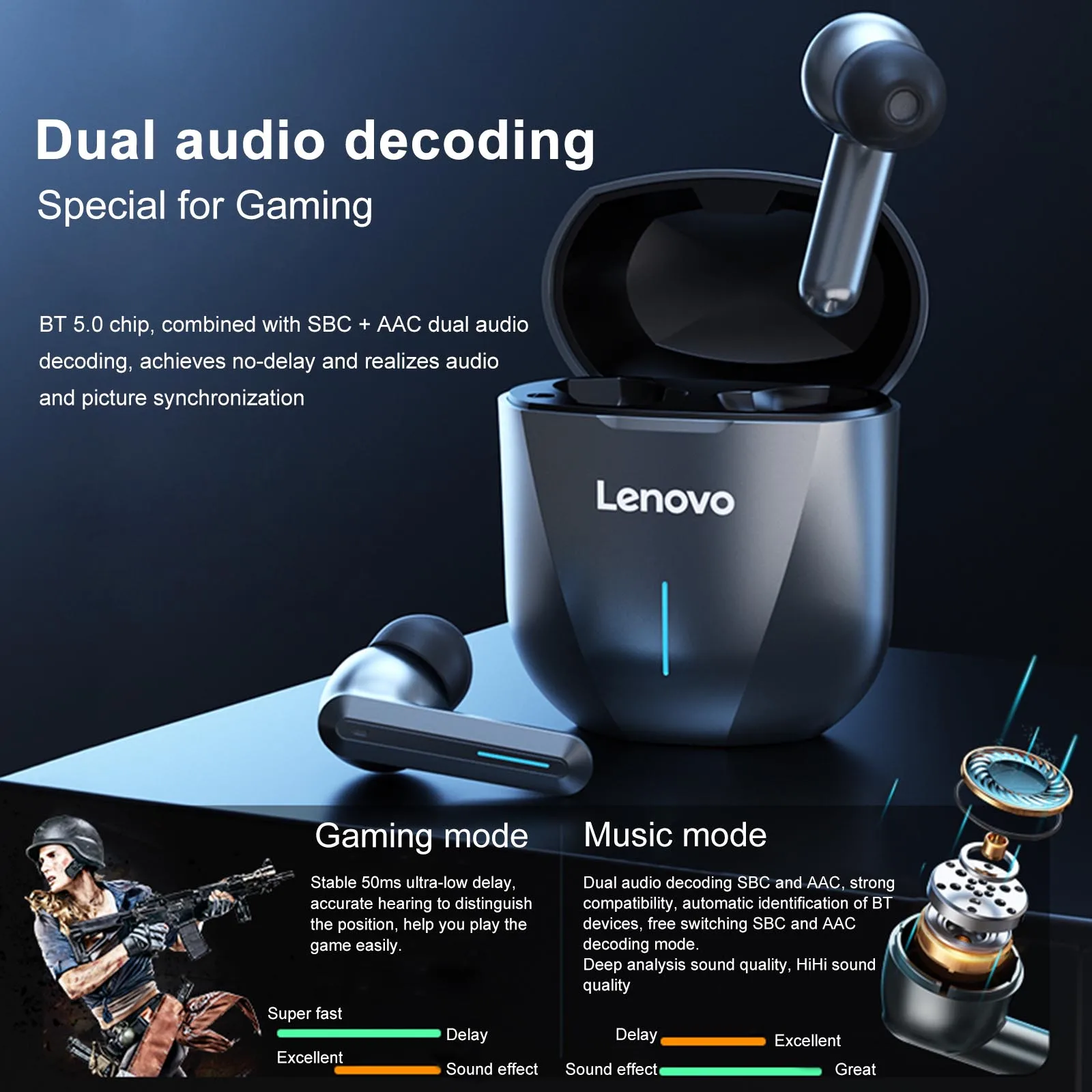 Особенности:Игровая гарнитура с низкой задержкой, одна клавиша для переключения музыки/игрового режима, светодиодный эффект освещения, подчеркивающий атмосферу игры.BT 5,0 обеспечивает высокую скорость передачи данных, стабильное соединение и низкое энергопотребление. Автоматическое Сопряжение после вынута из зарядный чехол.Многофункциональное сенсорное управление, поддержка коммутационных песен, телефонных звонков, управления громкостью и пробуждения голосового ассистента.Наушники с одним ухом и аккумулятором 40 мА · ч автоматически заряжаются в зарядный чехол емкостью 400 мА · ч, обеспечивая около 4 часов работы при полной зарядке.Встроенный микрофон высокой четкости, интеллектуальное шумоподавление, обеспечивает более четкий и реальный говорящий звук в стереорежиме. Примечание:Переключатель режима «Музыка/игра»: удерживайте правую гарнитуру в течение 2 секунд, чтобы войти в игровой режим, а звуковой сигнал-«режим игры». Нажмите и удерживайте правую гарнитуру снова в течение 2 секунд, чтобы выйти из режима игры и войти в режим музыки, а звуковой сигнал-«режим игры выключен». Характеристики:Бренд и модель: Lenovo XG01Версия BT: BT 5,0Диаметр привода: 12 ммЦвет: розовый/серый/белый (по желанию)Расстояние передачи: около 10 метров (без препятствий)Зарядный чехол Ёмкость: 3,7 V 400mAhНаушники Батарея Ёмкость: 3,7 V 40 мА * чВремя работы: 4 часаВремя зарядки гарнитуры: 1,5 часовВремя зарядки чехол: 2 часаРазмер посылка: 15*8,3*4,5 см/5,9*3,3*1,8 дюймовПосылка Вес: 155g/5,5 oz Посылка:2 * наушники1 * чехол для зарядки1 * USB кабель для зарядки3 * пары 0f Сменные наушники (S/M/L)1 * Руководство пользователя (на английском языке)
