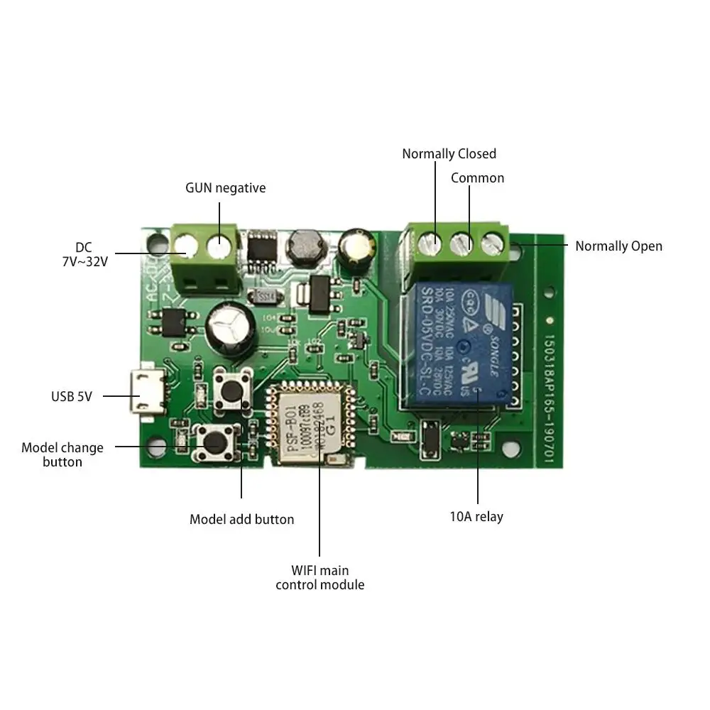 Тип 1. Рабочее напряжение: 7-32 в Тип 2. Рабочее напряжение: 7-32 В, поддержка 433 МГц RF Тип 3. Рабочее напряжение: 7-32 В, поддержка 433 МГц RF (включая пульт дистанционного управления) * С инструкцией по включению сигнала светильник инструкцией по включению реле * Мощность <1 Вт и Ток покоя: 80 мА * Ток Отключения <10 А, напряжение отключения <250 Релейный режим 10 А * Срок службы модели реле более 1000, 00 * Сопротивление изоляции: 100 * Максимальное время включения: 15 м * Максимальное время выпуска: 5 м * Рабочая температура: от-40 до 70 градусов * Рабочая влажность: от 40% до 80% относительной влажности * Функция подключения по умолчанию: нажмите на открытое реле на мобильный телефон, затем автоматически отключите тягу (по умолчанию одна секунда), оно имеет функцию синхронизации одновременно. * Самоблокировка при нажатии кнопки подключения и блокировки при включенном светильник. Нажмите «открыть реле», чтобы натянуть, нажмите «закрыть реле», чтобы отключить.