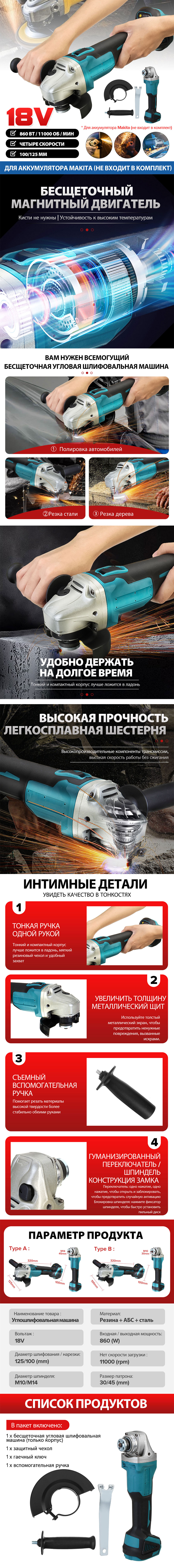Угловая шлифовальная машина BLMIATKO, 4 скорости, 125 мм, 100 мм, 18 в