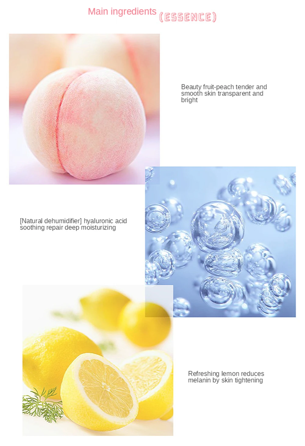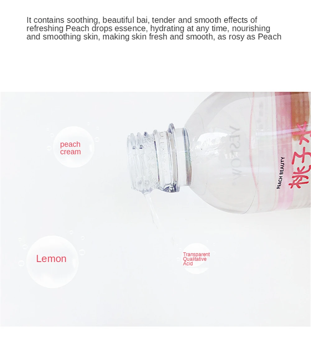 Название продукта:Персик Тонер для лицаЭффективность:Увлажнение и омоложение кожи, контроль жирности, подтягивание кожи, сужение порВес нетто: 450 млОсновной ингредиент: Экстракт плодов меда персика, гиалуронат натрия, компонент бактерий молочной кислотыПодходящие типы кожи:ОбщиеКол-во:1 шт.Срок годности:3 года1. Отборные ингредиенты, без алкоголя, без Nippon эфира антисептик, безопасен в использовании2. Экстракт плодов меда персика, фруктовый кислотный состав, улучшает рот3. Молочная кислота бактерии ингредиенты, улучшить кожу, баланс воды и масла4. Строго выберите гидратированный персик в качестве сырья, чтобы сделать кожу влажной и эластичной