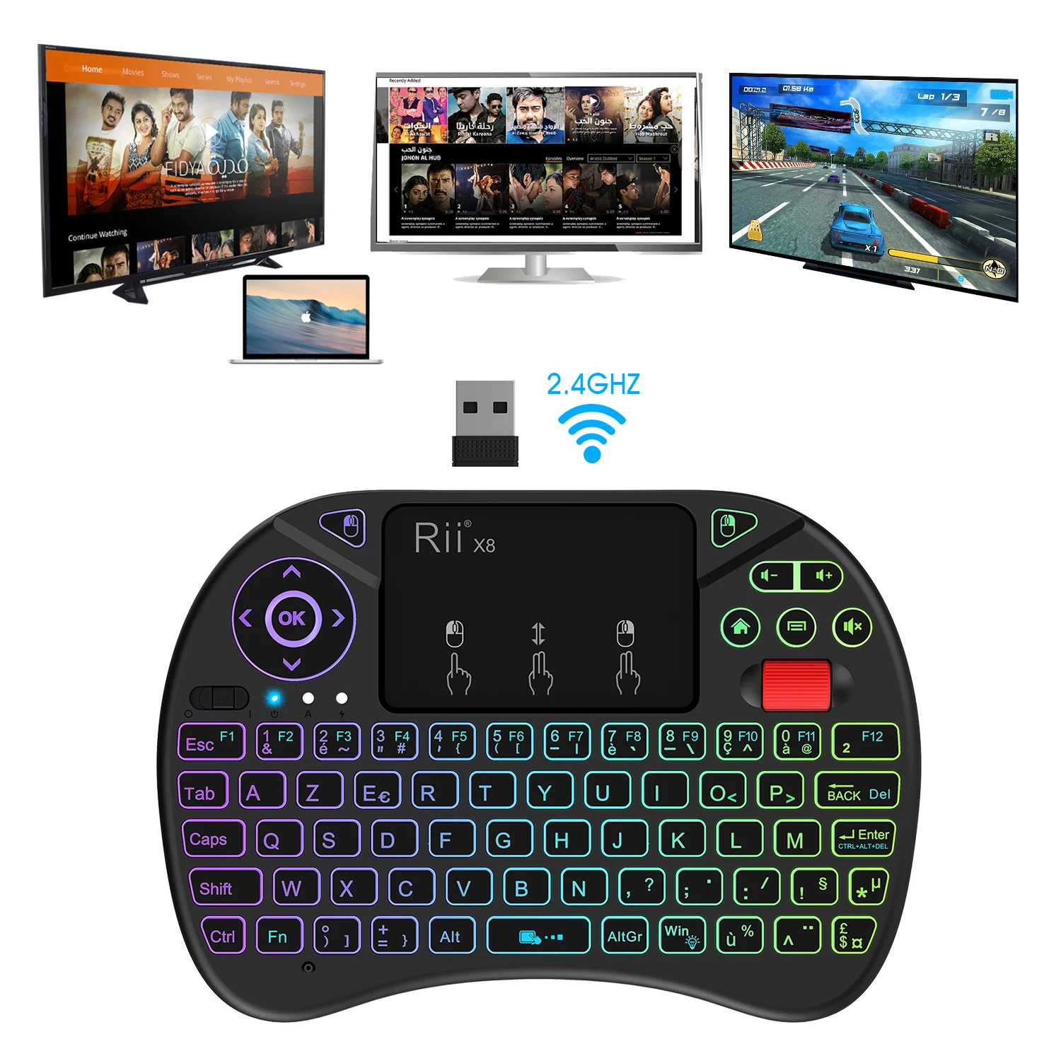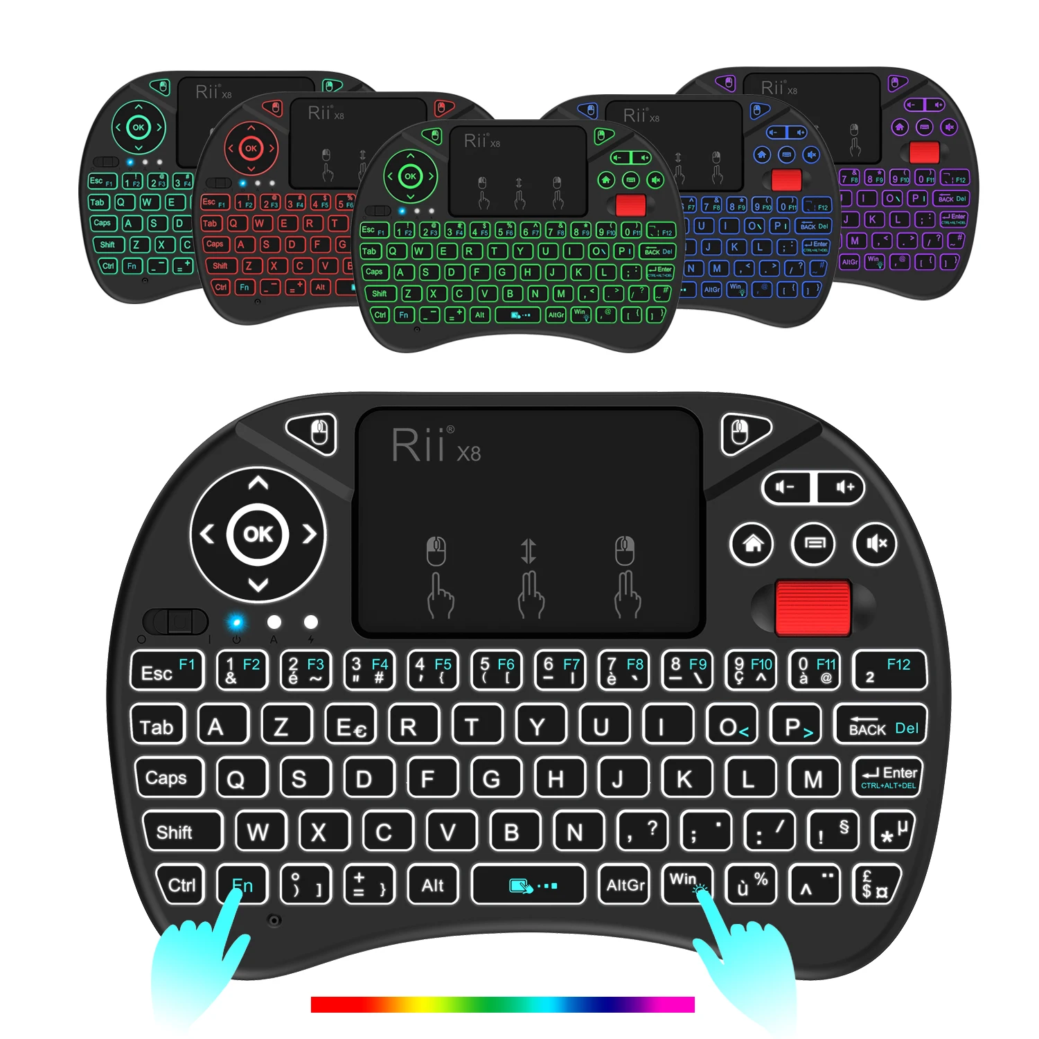 Оригинальный Rii X8 2,4 GHz AZERTY мини французская беспроводная клавиатура с тачпадом, изменяемый цвет со светодиодной подсветкой, литий-ионный аккумулятор
