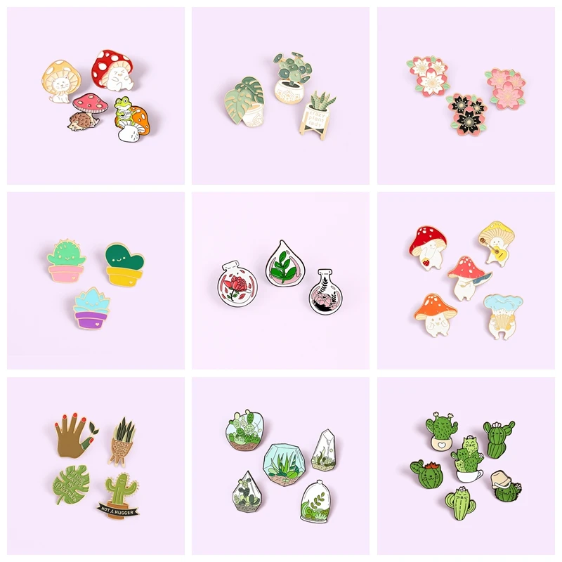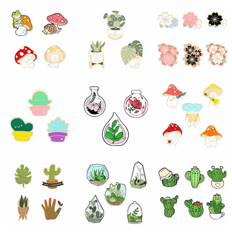 Брошь зеленое растение в горшке, эмалированная булавка-кактус, грибы цветы, на сумочку, лацкан, милый металлический значок, ювелирное украшение, подарок для фанатов, 2-6 штуккомплект