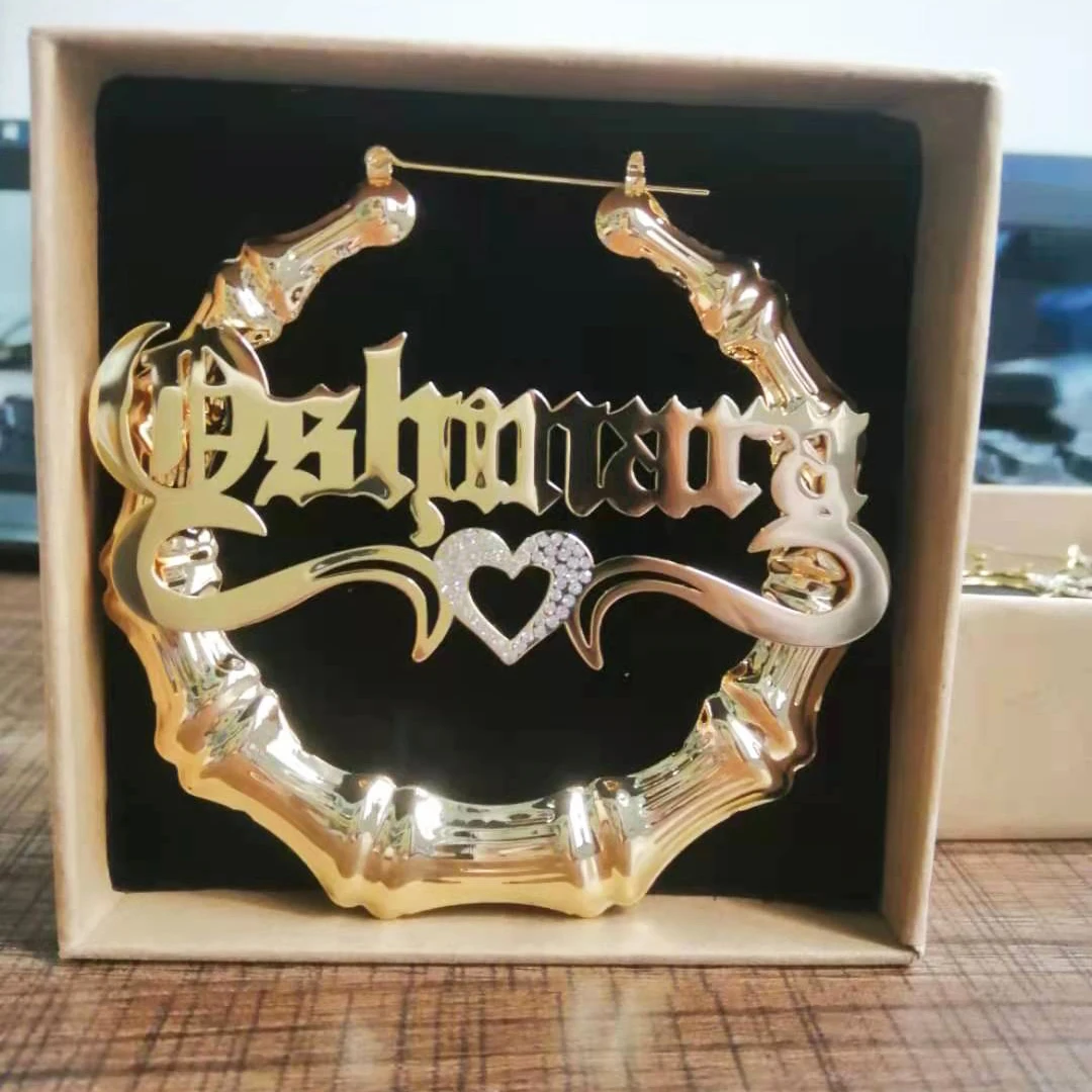 Индивидуальные серьги-кольца с бамбуковыми именами, серьги с украшением в виде сердца, Бамбуковые серьги с персонализированными буквами, большие именные серьги, подарок для женщин