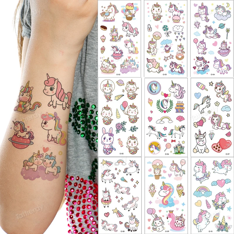 10 шт.лот, единорог, радуга, временные татуировки для детей, татуировка на лицо, дети, лес, мультфильм, тату, милый набор, водостойкая вода
