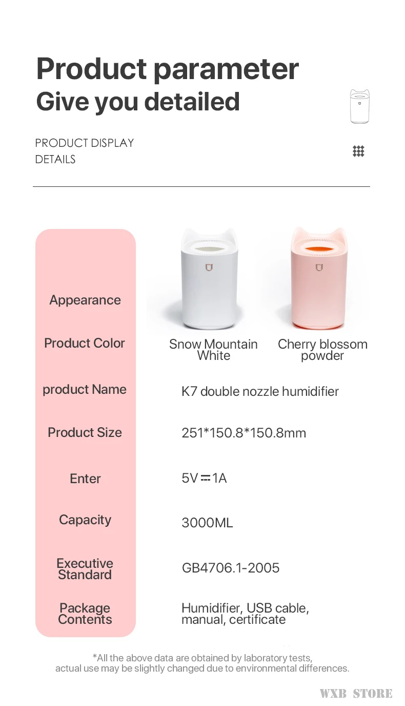 Область применения:<20 ㎡Рабочее напряжение: DC5VРабочий ток: 1000 мАУслуги мощность: 3,5-4WЕмкость воды: 3000 млВремя работы: 8-16 часовКоличество распыления: 45-60 мл/чМатериал: АБС + ПП + электрическая частьИсточник питания: USB кабель (без аккумулятора, не может быть заряжен)Цвет: белый, розовый