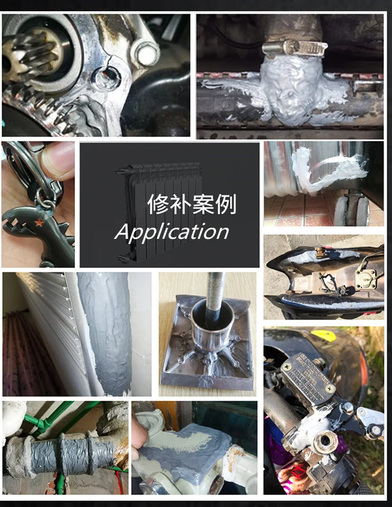 Этот материал используется для ремонта и герметизации отверстий для песка, трещин и поломок стали, железа, алюминия, таких как радиатор, литье металла, механическое оборудование и автозапчасти.