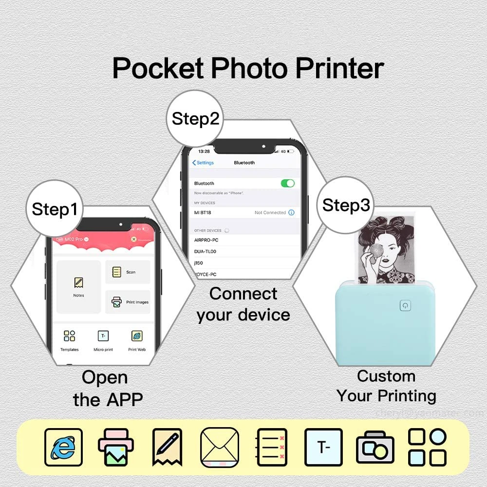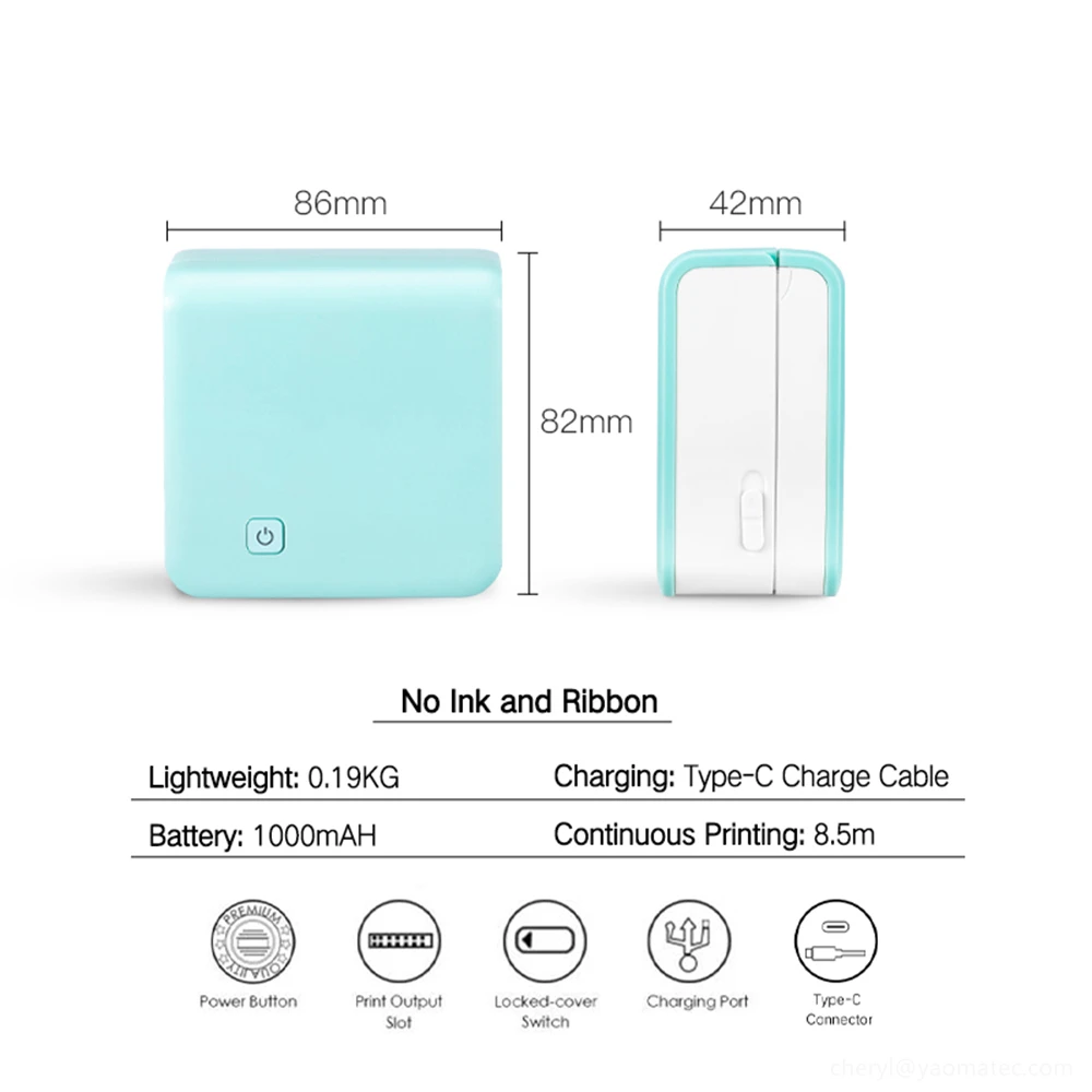 Размер: 86*82*42 ммПиксель: 300 точек/дюймВес: 190 гСпособ подключения: BluetoothSuport: применяется к Anroid 4,0 IOS8.0 или вышеВнешний вид: квадратный с закругленными углами, простой и удобныйФункция: печать текста и фотографий, заметки, оформление дневника, заметки для учебы, список дел