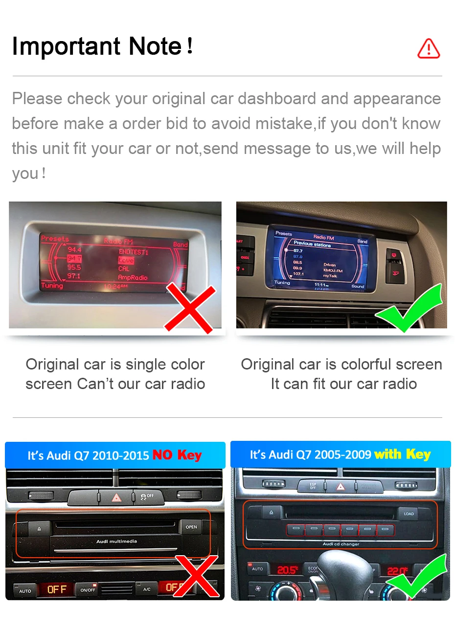 Важное примечание!Пожалуйста, проверьте оригинальную приборную панель автомобиля и внешний вид, прежде чем сделать заказ, чтобы избежать ошибки. Если вы не знаете, что это устройство подходит для вашего автомобиля или нет, отправьте нам сообщение, мы поможем вам.Оригинальный автомобиль с одним цветным экраном не подходит для нашего автомобильного радиоОригинальный автомобиль-это цветной экран, который подходит для нашего автомобильного радио.