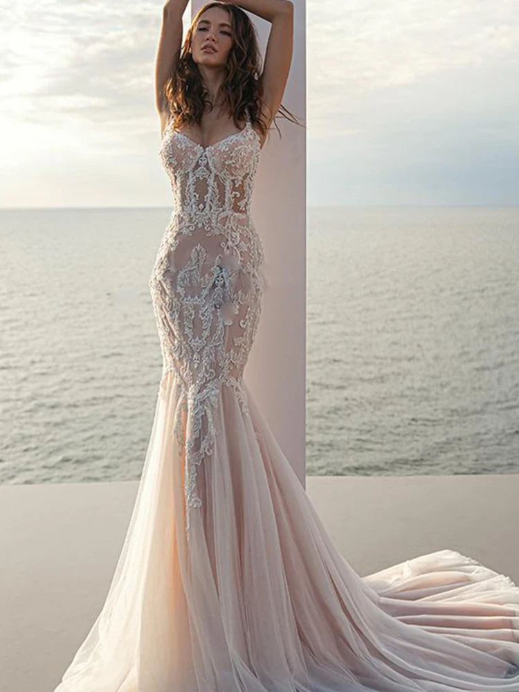 Платье свадебное кружевное с V-образным вырезом, пикантное пляжное платье-Русалка для невесты, с корсет на ремнях-спагетти, на заказ, лето