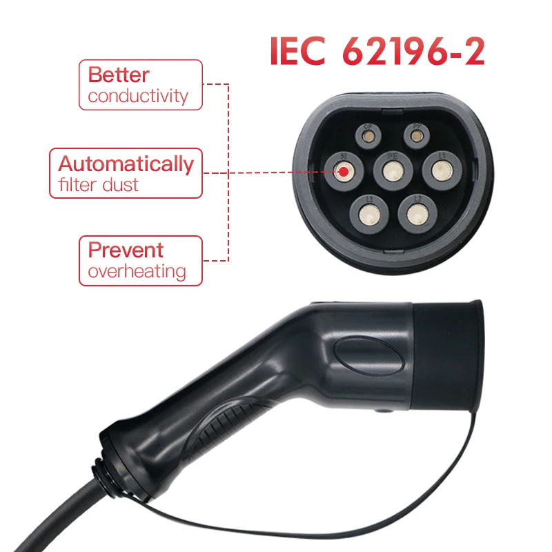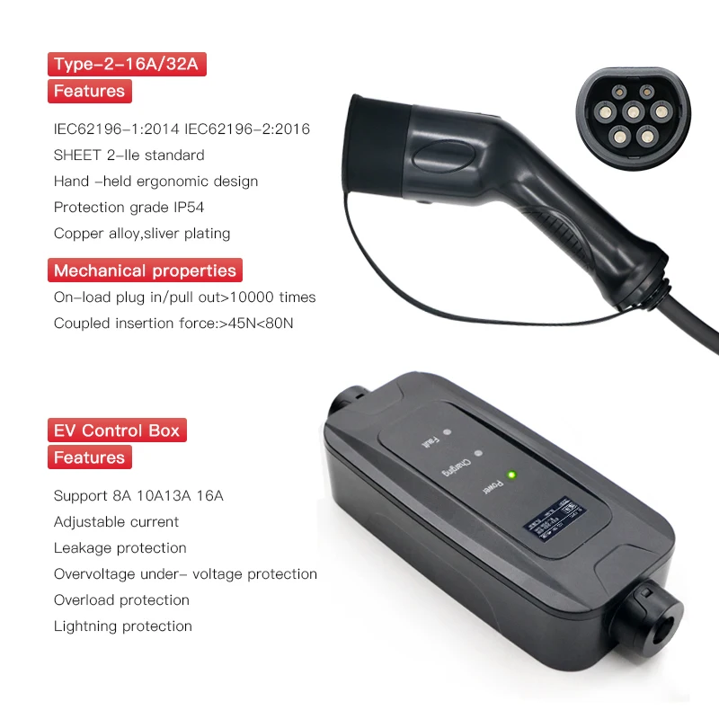 1. Разъем для зарядки: 7 контактов (соответствует стандарту IEC 62196-2)2. Разъем питания: штепсельная вилка Schuko3. Длина шнура зарядного устройства: 5 м4. Номинальное Напряжение: 220/250V5. Номинальный ток: 16A6. Рабочая температура: -30 ℃ ~ + 55 ℃7. Рекомендуется использовать в помещении8. CE признанный компонент
