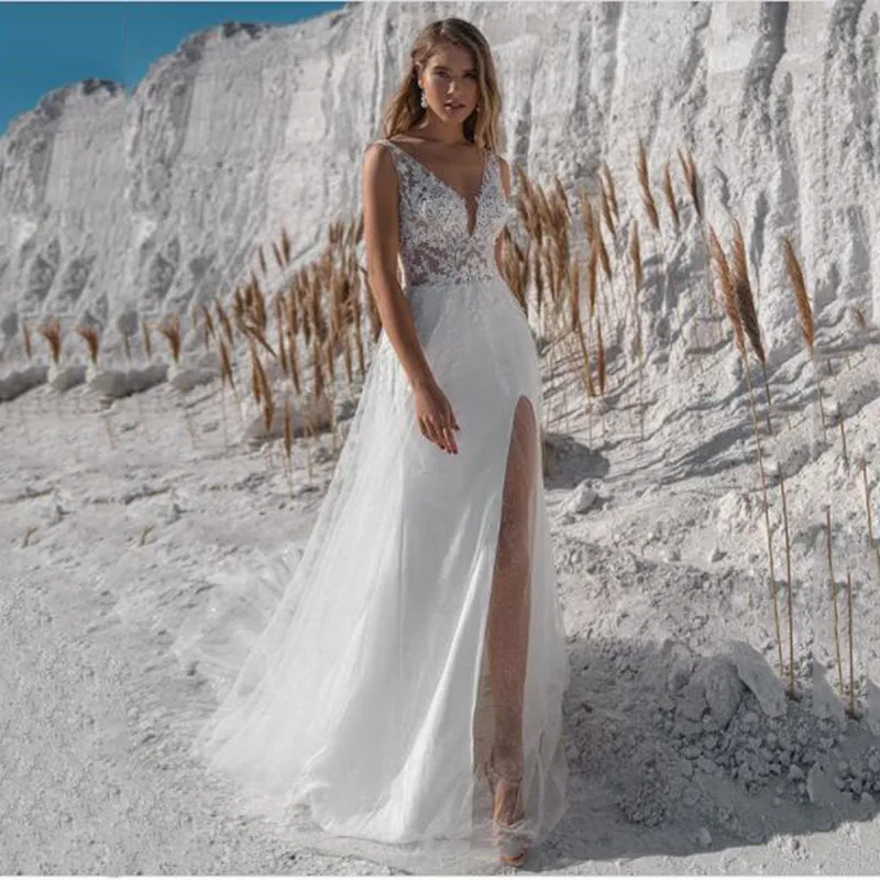 Женское свадебное платье с V-образным вырезом, разрезом и разрезом