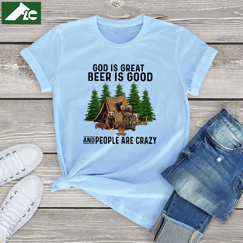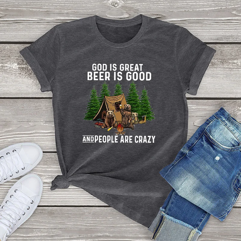 Хлопковая футболка с медведем для кемпинга, женская одежда, женские рубашки с надписью God is Great Beer is Good People are Crazy Funny Bear, модные топы для девочек