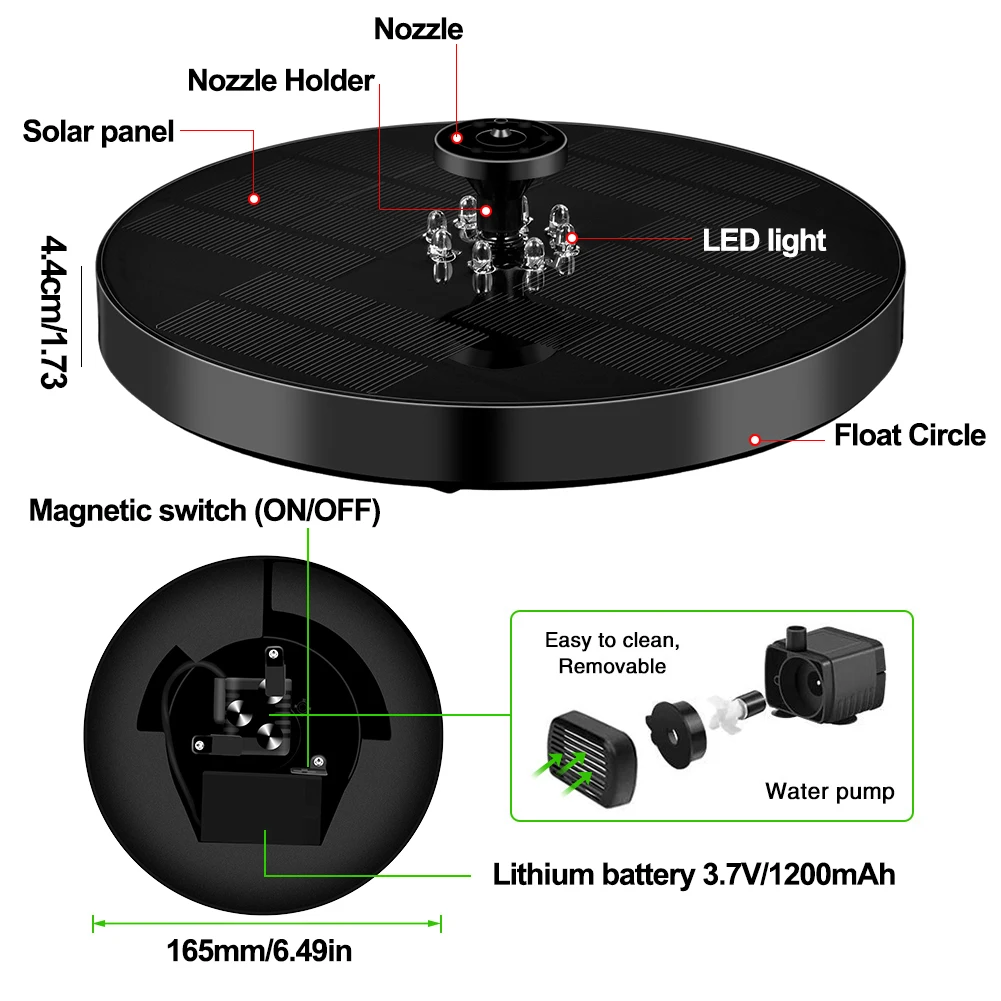 2. Великолепный СВЕТОДИОДНЫЙ красочные светильник s: 8 светодиодный светильник, в тех случаях, когда светильник с датчиком обнаружения наступает ночь, есть три цвета (красный, зеленый и синий), светильник, делает ночной бассейн более красивым. Фонтан гнезда солнечной птицы может автоматически управляться под прямыми солнечными лучами всего за 3 секунды. Он имеет встроенный высокопроизводительный полимерный литиевый аккумулятор. Высота распыления больше 30 см, независимо от облачного или солнечного. Он может работать в течение 5 часов без электричества или аккумулятора.