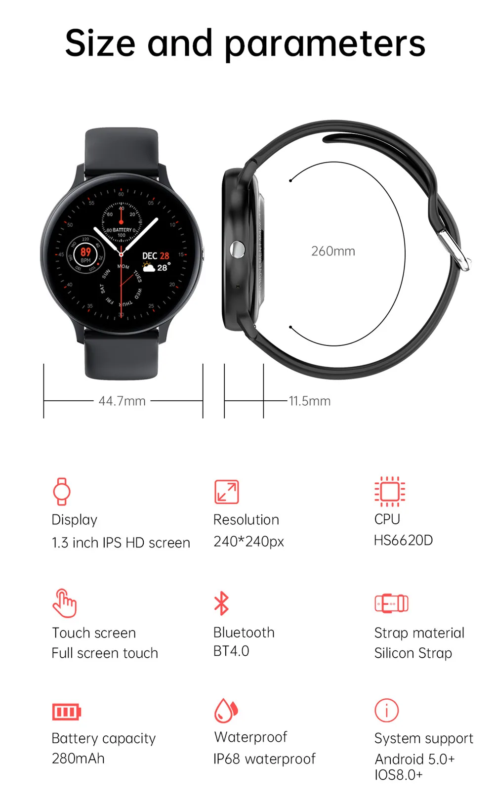 Добро пожаловать в наш магазин! Качество на первом месте + самое лучшее обслуживание. Все клиенты-наши друзья Параметры продукта Экран: 1,3-дюймовый IPS Сенсорная панель: сенсорный экран Аккумулятор: 280 мАч Приложение: Wearfit 2,0 Метод зарядки: подходит для магнитной Зарядки Водонепроницаемость: IP68 Аппаратный параметр Версия Bluetooth: BLE4.0 Звонки по Bluetooth: BT3.0 Версия системы: Android выше 4,4 или IOS выше 8,4 Функция программного обеспечения Прием/отклонение телефонных звонков/телефонных звонков с циферблатом, мониторинг сердечного ритма, мониторинг кровяного/кровяного давления, мониторинг сна, напоминание о сидячем положении, спортивный шагомер/потребление калорий/запись отслеживания/время упражнений, напоминание о звонках и отображение, сообщение толкается и отображается, камера дистанционного управления, Автоматическое Измерение частоты сердечных сокращений, измерение нескольких видов спорта, напоминание о часах, напоминание о тревоге, 5 видов циферблатов по умолчанию. Индивидуальные Циферблаты часов в приложении являются необязательными. Язык Браслет поддерживает языки: английский, китайский, испанский, французский, русский, португальский, польский Приложение (Wearfit 2,0) поддерживает языки: английский, японский, корейский, немецкий, испанский, французский, итальянский, русский, португальский, арабский, китайский. Посылка в комплекте Хост, зарядное устройство, ремешок на запястье, руководство, коробка После получения часов сначала заряжайте. Потому что после длительного периода логистики часы имеют низкую батарею. Перед использованием отсканируйте qr-код в руководстве, чтобы загрузить приложение и подключить его к часам с помощью приложения.