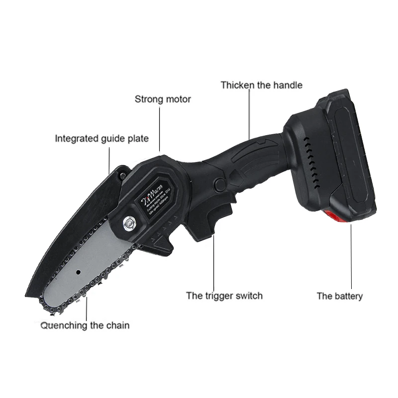 Особенность:-Литиевый аккумулятор большой емкости. Технология литиевого аккумулятора, Защита аккумулятора от перегрузки, быстрая зарядка.-Медный сердечник двигателя. Сильная мощность, быстро собирает энергию, выдает сильную мощность.-Качественная направляющая цепь. Острая и износостойкая, глубокая закалка более износостойкая и ровная резка.-Эргономичная ручка, которая очень удобна и безопасна для переноски.-Ручка имеет противоскользящую конструкцию, которую очень удобно захватывать.-Безопасность пиления, эффективно повышают эффективность вашей работы.-Бесконечно переменная скорость, более детальная обрезка, лучшая защита деревьев.