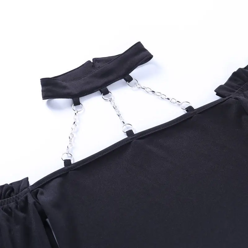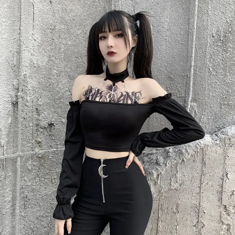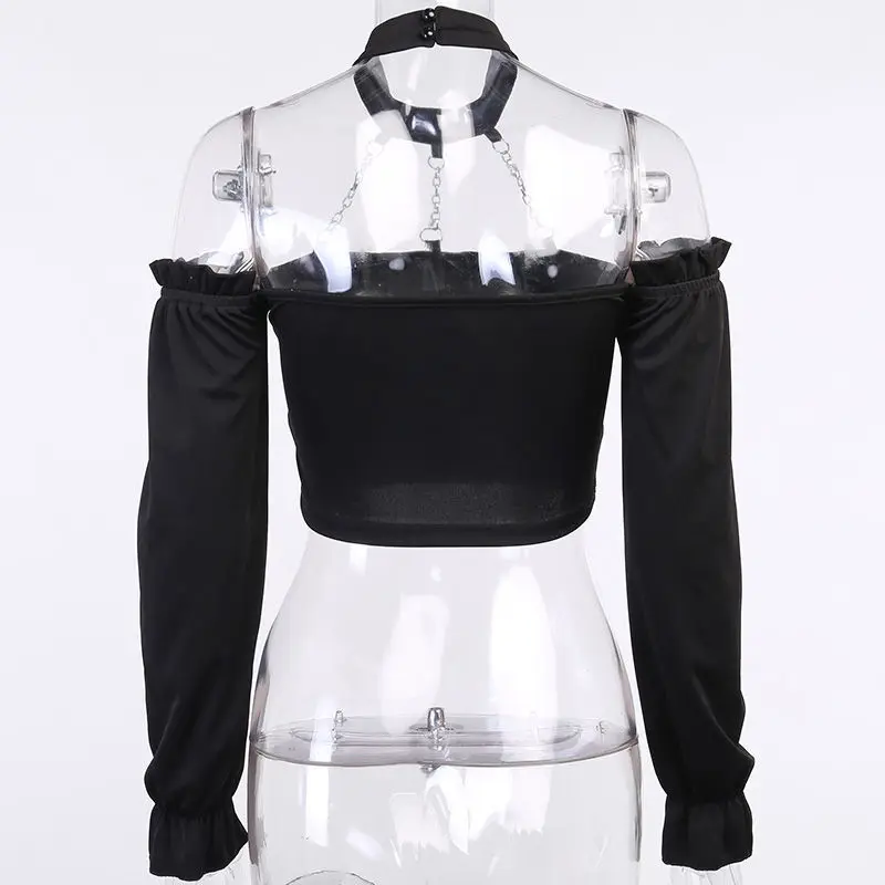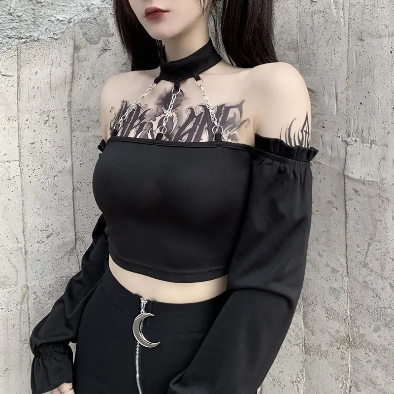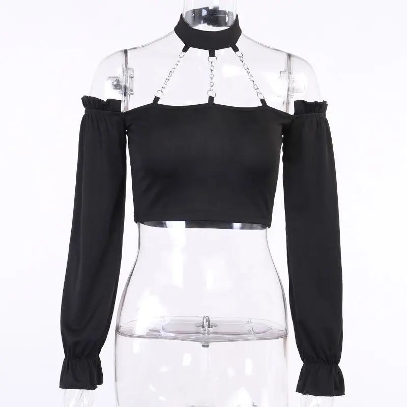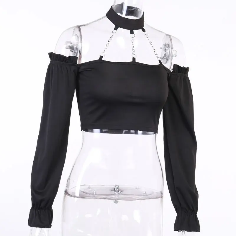 Женская футболка на плечо SONDR, черная футболка в готическом стиле с длинным рукавом, украшенная цепочкой в стиле панк, сексуальная женская короткая футболка