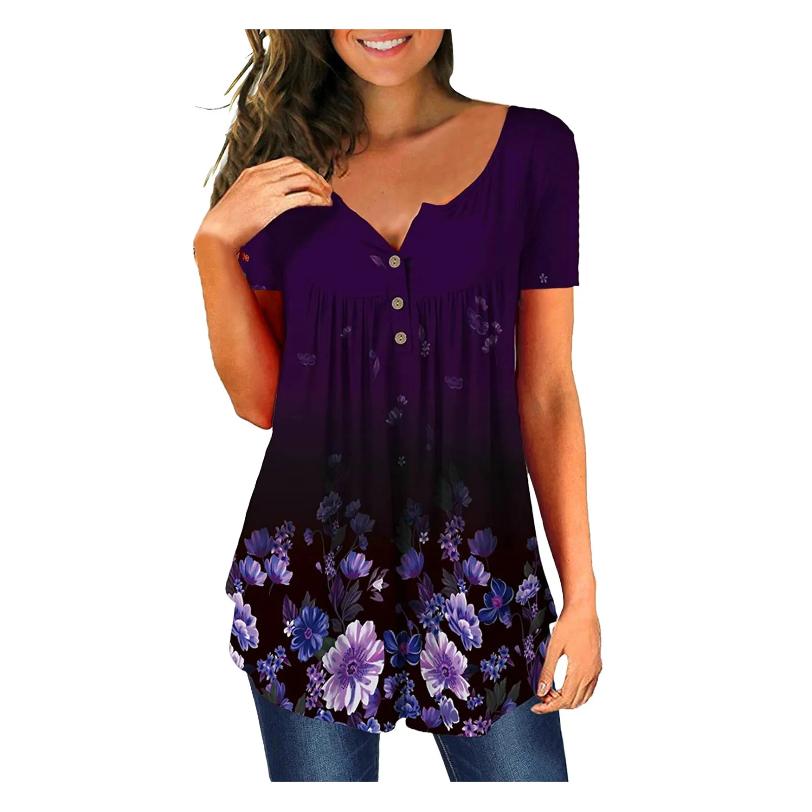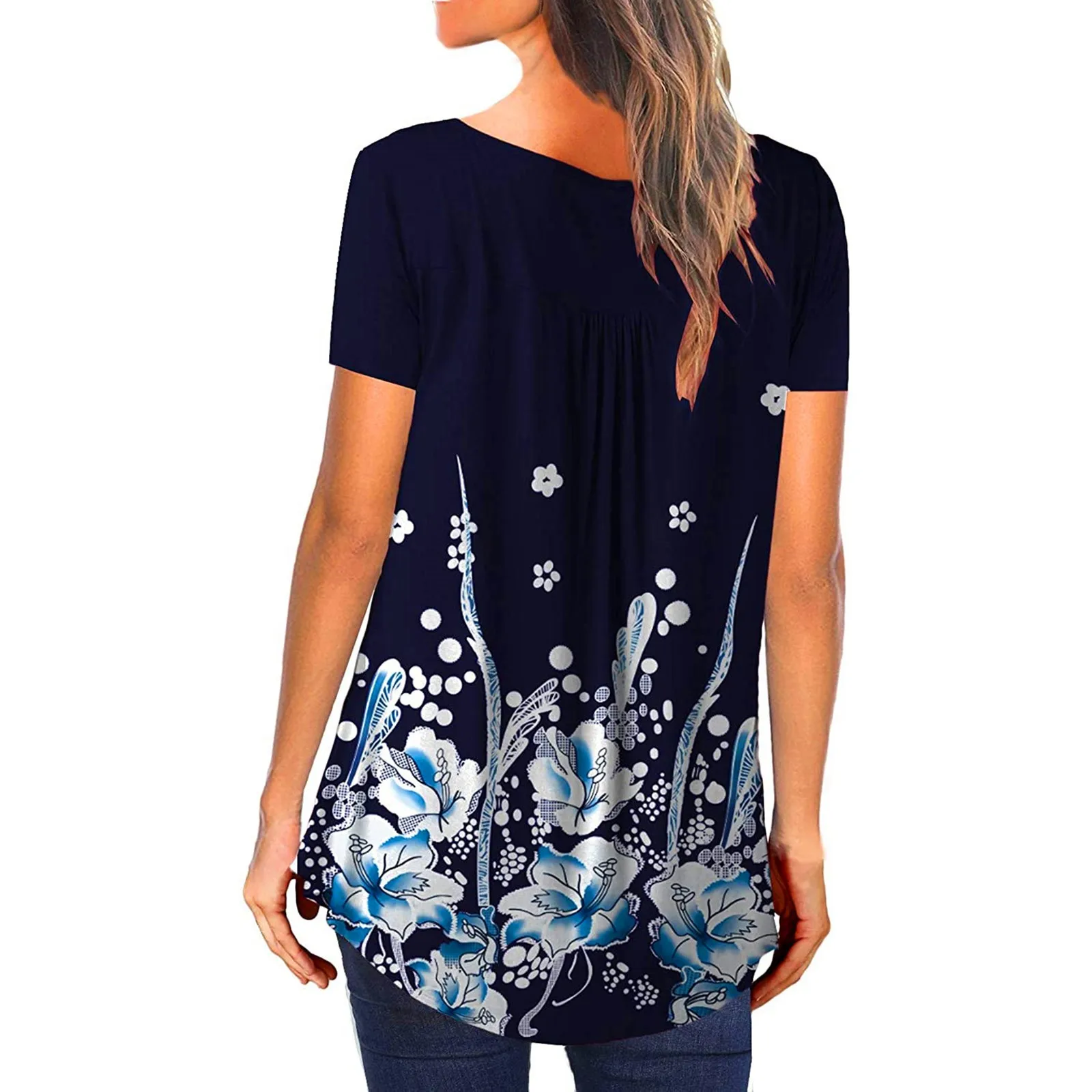 Женская туника с v-образным вырезом и цветочным принтом; Топы с пуговицами и короткими рукавами; Свободная футболка