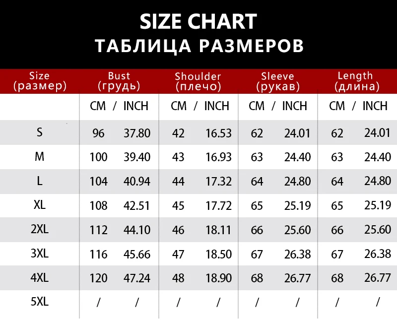 • Пожалуйста, строго следуйте таблице размеров, чтобы выбрать размер. Не выбирайте товар в соответствии с вашими привычками.• Товар измеряется вручную, он может отличаться на 2-4 см.• Эта куртка Азиатского размера, Азиатский размер меньше примерно на 2 размера, чем европейские/американские размеры.• Все вышеуказанные измерения являются фактическими. Для удобной посадки, пожалуйста, добавьте 8-10 см к вашему телу обхват груди при выборе размера из приведенной выше таблицы.• Пожалуйста, укажите свой рост и вес, чтобы проверить свой размер при размещении заказа.